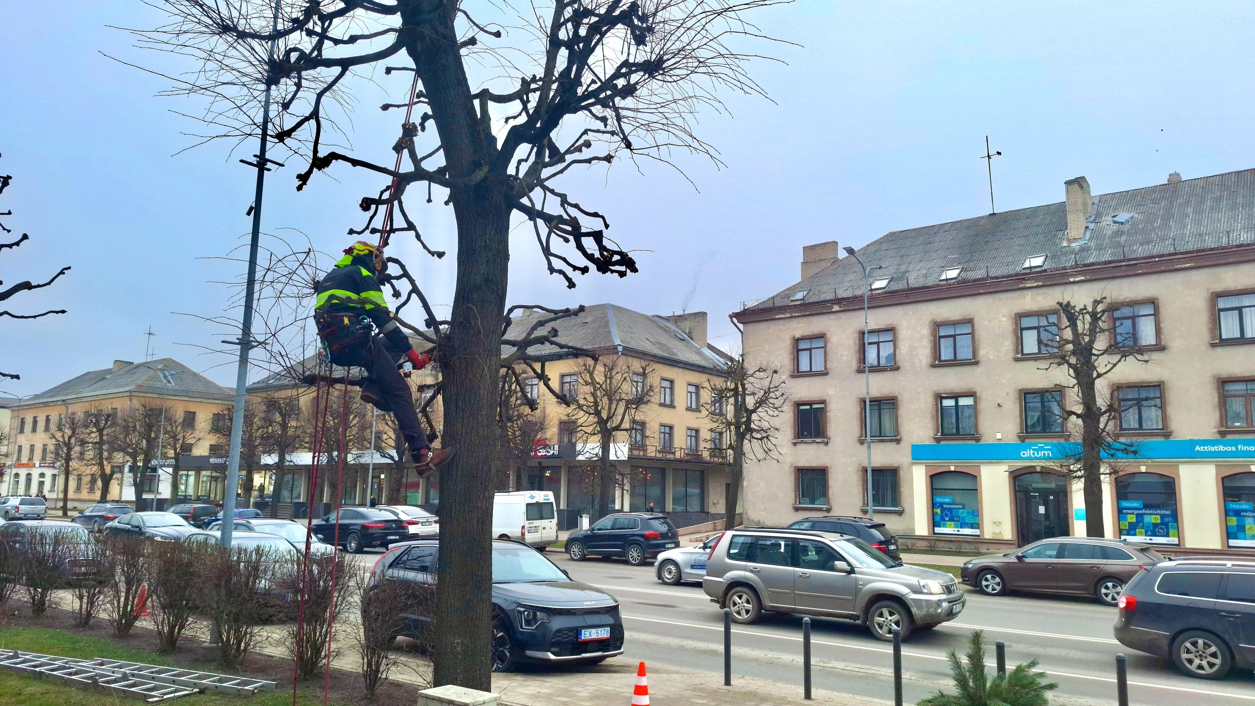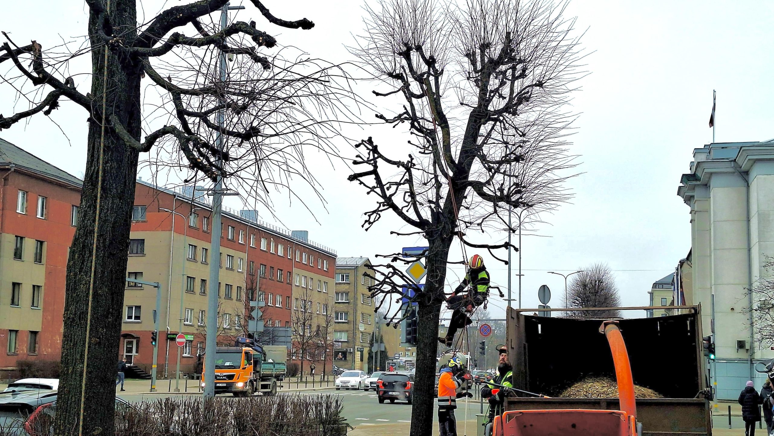 Liepu vainagu kopšana notiek arī Miera ielā pie rotācijas apļa, koku zarus izzāģēs arī pie ceļu braucamās daļas, kur tie traucē satiksmes kustībai.