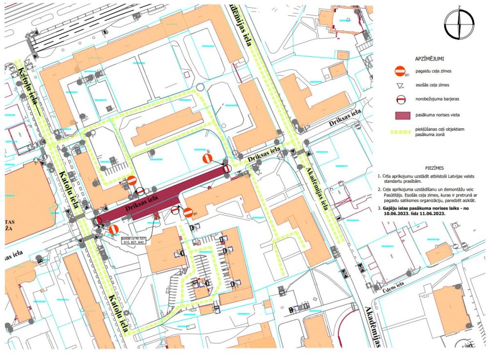No 10.jūnija plkst. 08.00 līdz 11.jūnija plkst.23.00 slēgta satiksme Driksas ielā, posmā no Katoļu ielas līdz Akadēmijas ielai.