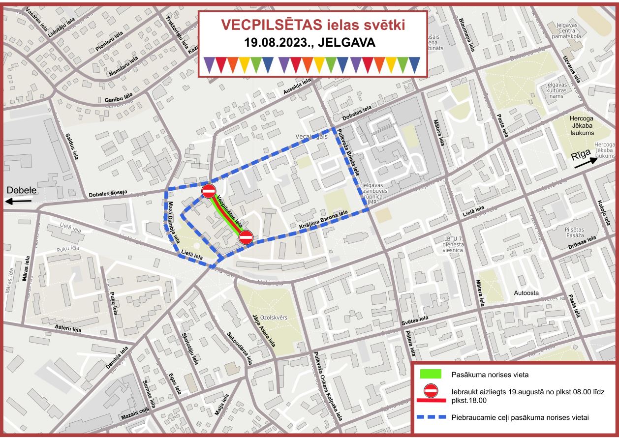 19. augustā “Vecpilsētas ielas svētku” laikā būs satiksmes ierobežojumi 19.augustā norisināsies pasākums “Vecpilsētas ielas svētki”. Pasākumu norises vietās paredzēts satiksmes izmaiņas. Vecpilsētas ielas svētku satiksmes ierobežojumi Vecpilsētas ielaDalītiesFacebookTwitterGoogle+PinterestLinkedIn Līdzīgi rakstiIerobežota satiksme un gājēju kustība Dobeles šosejas un Atmodas ielas krustojumā – Pagarinājums16.12.2025Slēgta satiksmes kustība Ošu ceļā (no Riekstu ceļa līdz 1.līnijai, pagarinājums)16.12.2025Satiksmes organizācija pie Zemgales Olimpiskā centra 27. decembrī16.12.2025