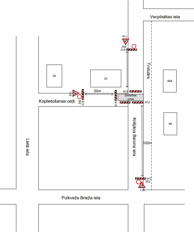 23. aprīlī tiks slēgta satiksme Krišjāņa Barona ielā no Pulkveža Brieža ielas līdz Vecpilsētas ielai un koplietošanas ceļā no Lielās ielas līdz Krišjāņa Barona ielai