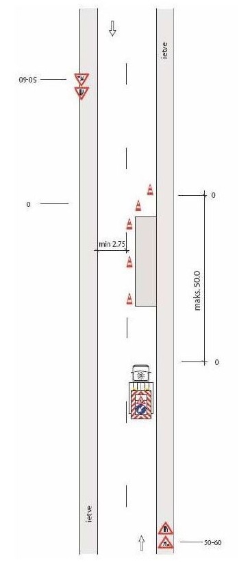 Satiksme tiks organizēta abos virzienos pa vienu braukšanas joslu ar priekšrocības zīmēm.