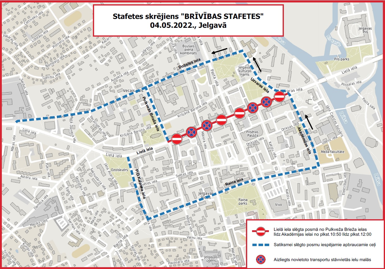 4. maijā Jelgavā notiks skrējiens “Brīvības stafetes”. Skrējiena laikā no pulksten 10.50 līdz 12.00 tiks slēgta satiksme Lielajā ielā no Pulkveža Brieža ielas līdz Akadēmijas ielai, līdz ar to būs slēgtas arī autobusu pieturas “Centrs” un “Mātera uz Lielās” Lielajā ielā abos virzienos. Pilsētas autobusi slēgto ielas posmu apbrauks pa apvedceļiem – skatīt šeit https://www.jelgava.lv/lv/jaunumi/zinas/-brivibas-stafesu-laika-bus-mainita-pilsetas-sabiedriska-transporta-kustiba/.