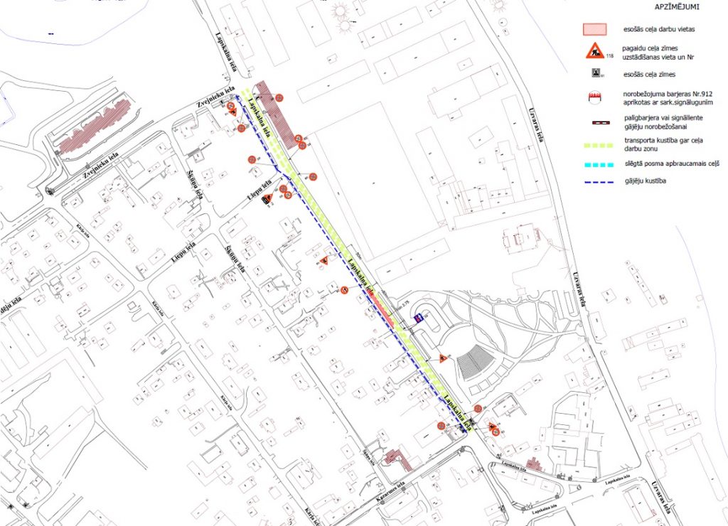 Būvdarbu laikā, Lapskalna ielas posmā no Zvejnieku ielas līdz Kazarmes ielai satiksme organizēta pa divām braukšanas joslām ar ierobežojumiem, satiksme organizēta ar ceļa zīmēm.