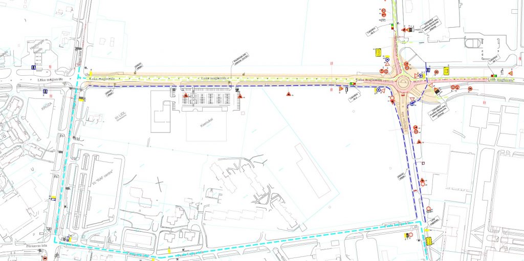 Divvirzienu satiksme organizēta ar pagaidu luksoforiem. Aviācijas ielas posms no Loka maģistrāles virzienā uz Paula Lejiņa ielu ir slēgts. Apbraucamais ceļš visiem transporta līdzekļiem organizēts pa Paula Lejiņa ielu, Pumpura ielu, Rīgas ielu un Loka maģistrāli.