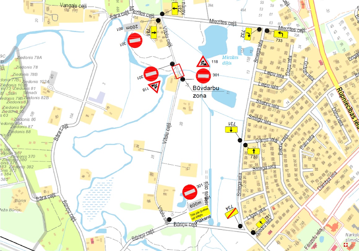 No 11. jūlija līdz 30. septembrim aizliegta satiksme Vītolu ceļa posmā no Būriņu ceļa līdz Miezītes ceļam būvdarbu laikā – Zaļās infrastruktūras izveidošana Sniega ielas pieguļošajās teritorijās, Jelgavā, ievērojot saskaņoto Satiksmes organizācijas shēmu.