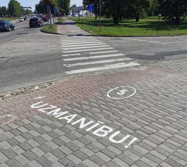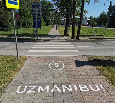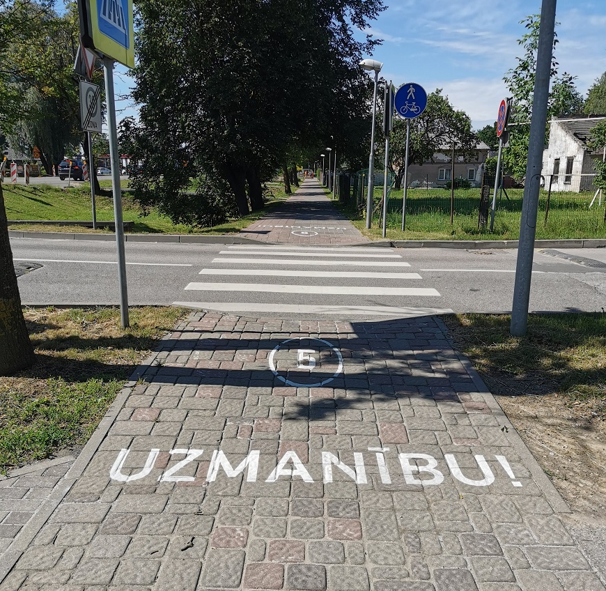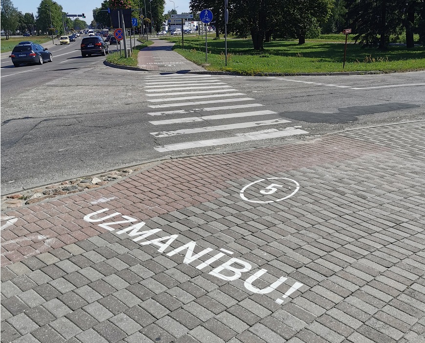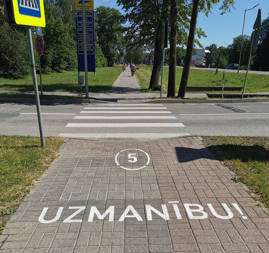 Pievēršot uzmanību neregulētu krustojumu drošai šķērsošanai ar velosipēdu, elektroskrejriteni, skrituļslidām, skrituļdēli un citu sporta vai atpūtas inventāru, ir organizēta horizontālā apzīmējuma “UZMANĪBU – 5” uzklāšana.