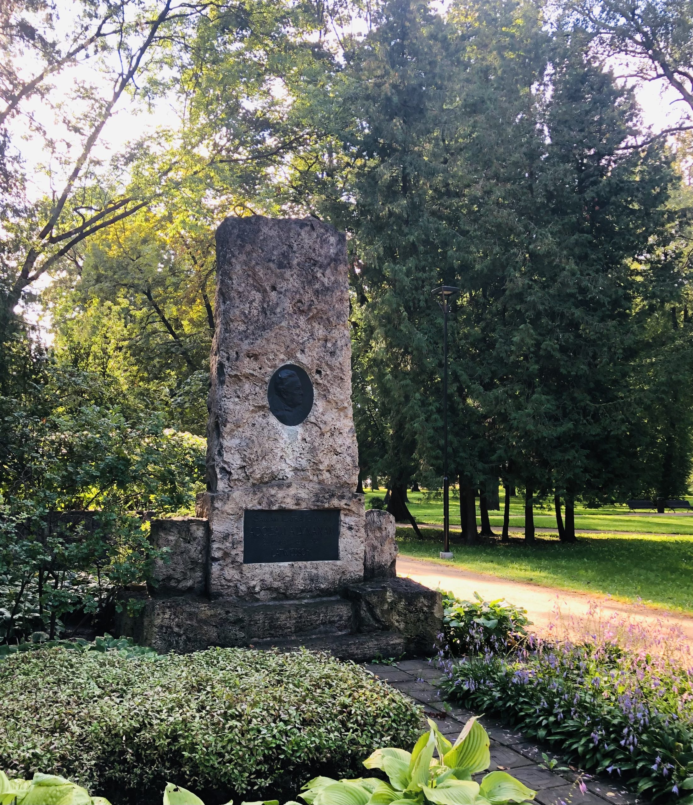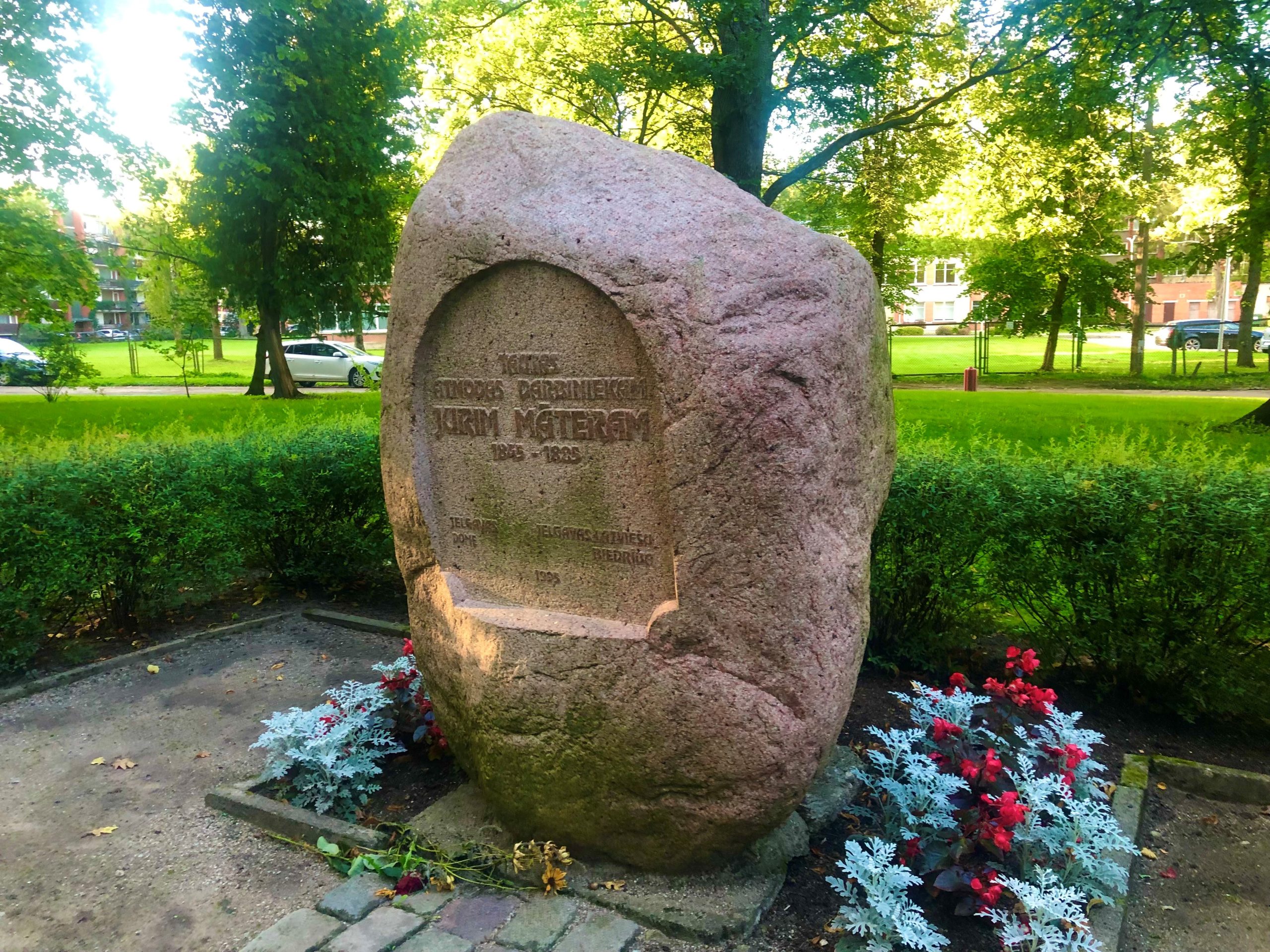 Informatīva plāksne skulptūrai “Dziesmu vainags” | Uzvaras parks | Akmens skulptūra veidota kā vainags triju savijušos laukakmeņu veidolā – šādas spirāles un diska forma ir sens harmonijas un attīstības simbols. Atvērums centrā simbolizē gara gaismu, pati skulptūra vēstī par dziesmām, cilvēkiem, tautu un vidi. Kompozīcija veidota no trim lieliem laukakmeņiem un diviem pamatakmeņiem. Vainaga apakšējā līmenī iespējas ievīt tekstuālu informāciju par Jelgavā notikušajiem dziesmu svētkiem. Skulptūra atklāta 2008. gadā, tēlnieks Ģirts Burvis. Plāksne atklāta 2009. gadā, tēlnieks Juris Dušelis. Materiāls: granīts. Plāksnes materiāls: misiņš.