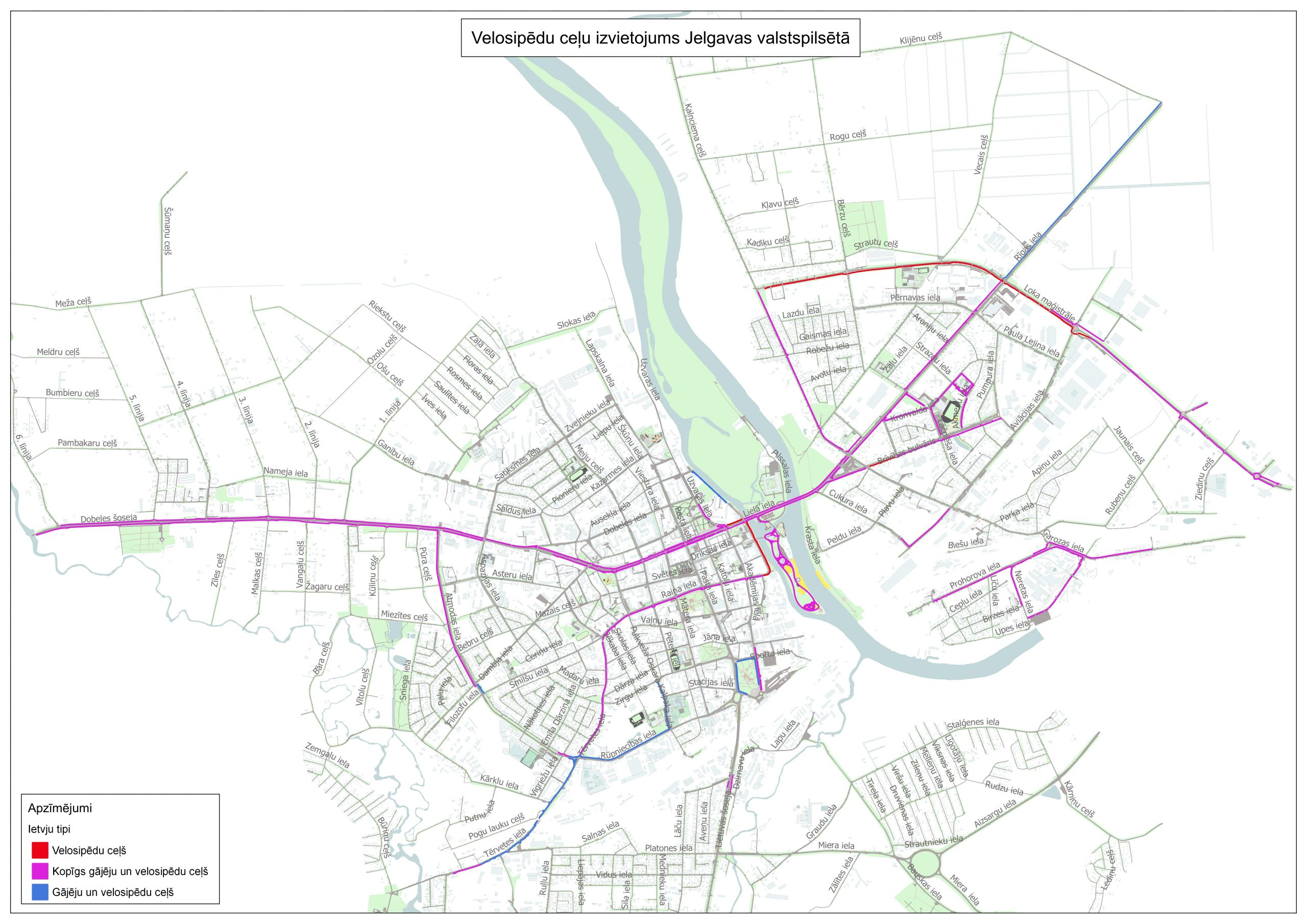 Raiņa iela no Tērvetes ielas līdz Elektrības ielai un Pilssalas iela no Lielās ielas līdz Pasta salai – ir atšķirīgas krāsas veloceliņa bruģis, bet nav ceļazīmju apzīmējumi;