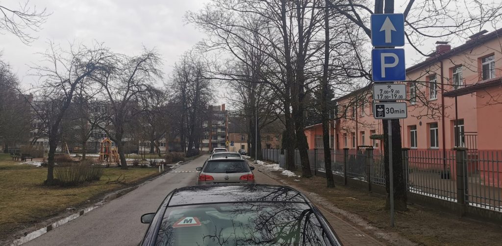 Uzstādītas arī zīmes, kas darba dienās no pulksten 8 līdz pulksten 18 ierobežo stāvēšanu uz 2 stundām, pārējā laikā automašīnas var novietot bez laika ierobežojuma. Uzstādītas ceļa zīmes Nr.537 “Stāvvieta” un papildzīmēm – Nr.828 “Darbības laiks” un Nr.840 “Stāvēšanas laiks”.