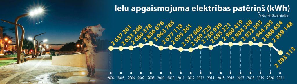 Kā uzsver Jelgavas pašvaldības iestādes “Pilsētsaimniecība” vadītājs Māris Mielavs, elektroenerģijas patēriņš ir atkarīgs no kopējās pieslēgto iekārtu jaudas un darbības laika: “Jelgavas pašvaldības stratēģija elektroenerģijas patēriņa samazinājumā ir balstīta uz esošo nātrija gāzizlādes spuldžu gaismekļu aizvietošanu ar attālināti vadāmo gaismas emitējošo diožu (LED) gaismekļiem. Tie patērē ievērojami mazāk elektroenerģijas un dod iespēju regulēt kopējo jaudu atkarībā no diennakts laika.”