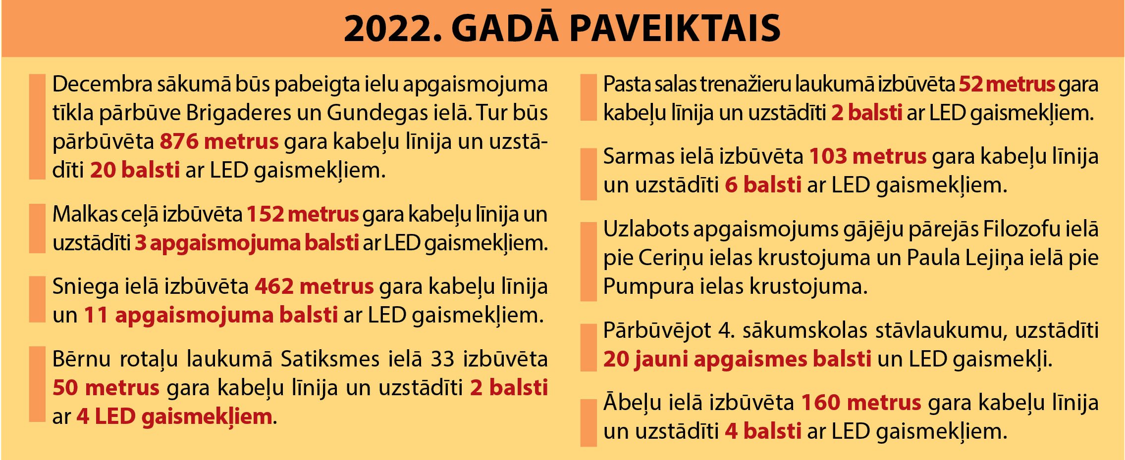 Pagājušajā gadā noslēdzās viens no nozīmīgākajiem projektiem ielu apgaismojuma modernizācijai. Tā gaitā 28 pilsētas ielās 1374 vecie gaismekļi nomainīti pret jaunās paaudzes LED gaismekļiem, kā arī rekonstruēts Stacijas parka apgaismojums. Liela daļa jauno gaismekļu ir aprīkoti ar kontrolieriem un apgaismojuma attālinātās vadības blokiem, kas ļauj nodrošināt apgaismojuma līmeņa regulēšanu atbilstoši transportlīdzekļu un gājēju aktuālajai plūsmai – uztverot cilvēku no 15 metru attāluma un automašīnu no 30 metru attāluma, automātiski tiek palielināta gaismas intensitāte. Jāpiebilst, ka viedā sistēma spēj uztvert ne tikai cilvēku un automašīnu klātesību, bet arī to ātrumu un virzienu.
