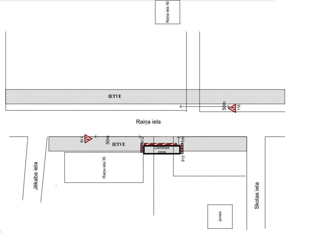 No 4. oktobra līdz 30. oktobrim ierobežota gājēju kustību Raiņa ielā, posmā no Skolas ielas līdz Jēkaba ielai, būvdarbu laikā – sakaru kanalizācijas pievada izbūve, ievērojot saskaņoto Satiksmes organizācijas shēmu.