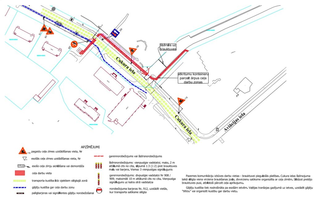 No 26. jūnija līdz 19. jūlijam ierobežota satiksme Cukura ielā, posmā no Pļavu ielas līdz Aviācijas ielai un Aviācijas ielā, posmā no Cukura ielas līdz Garozas ielai, būvdarbu laikā – tranšejas rakšana, kabeļa guldīšana, sadalnes montāža, ievērojot saskaņoto Satiksmes organizācijas shēmu.