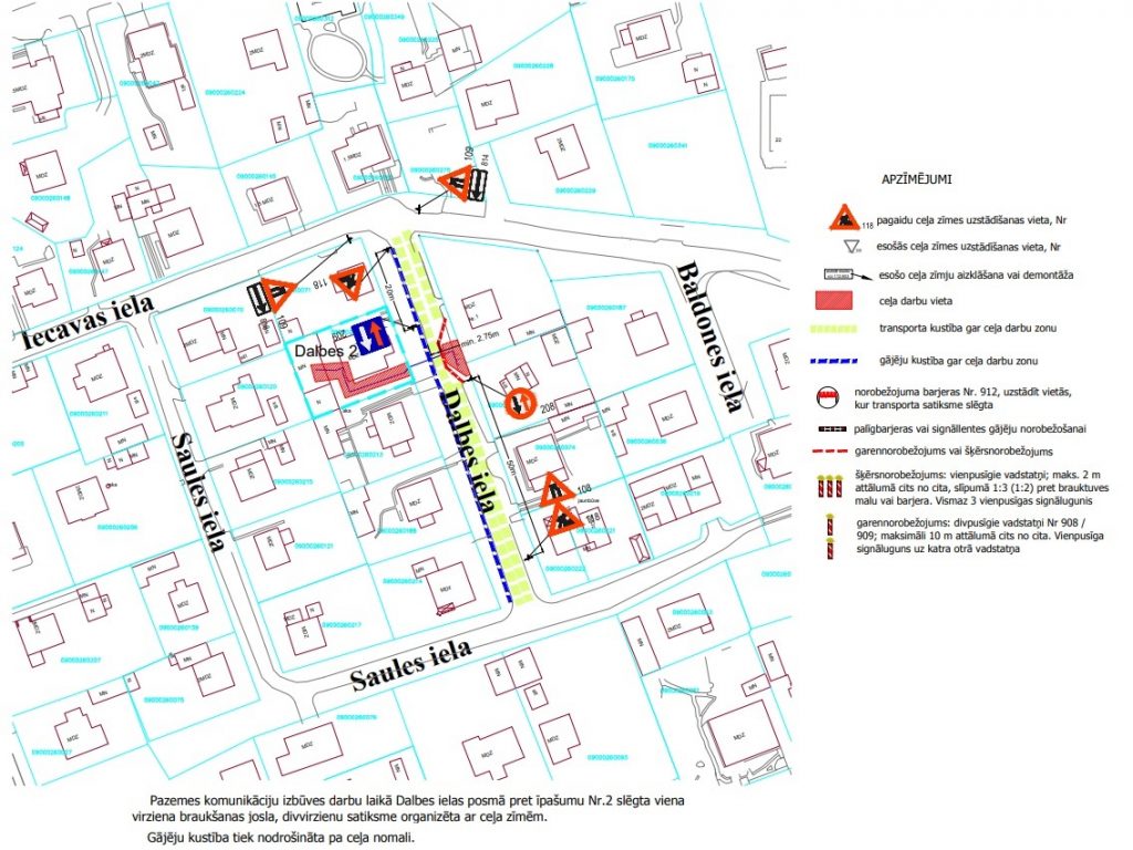 No 18. oktobra līdz 22. oktobrim ierobežota satiksme Dalbes ielā, posmā no Iecavas ielas līdz Saules ielai, būvdarbu laikā – 0.4kV kabeļa guldīšana, ievērojot saskaņoto Satiksmes organizācijas shēmu.