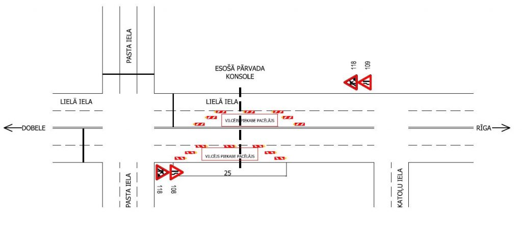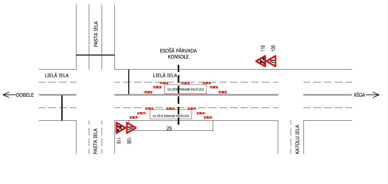 No 2020. gada 21. decembra plkst. 22.00 līdz 2020. gada 22. decembrim plkst. 06.00, no 2020. gada 22. decembra plkst. 22.00 līdz 2020. gada 23. decembrim plkst. 06.00 ierobežota satiksme Lielajā ielā, posmā no Katoļu ielas līdz Pasta ielai, būvdarbu laikā – iekārtu montāža uz ceļa pārvada, ievērojot saskaņoto Satiksmes organizācijas shēmu.