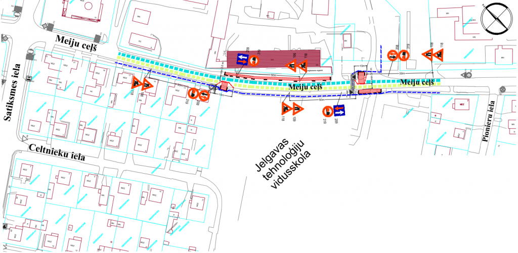 Viss būvdarbu posms – Pulkveža Brieža iela, posmā no Lielās ielas līdz Kazarmes ielai, Meiju ceļš posmā no Kazarmes ielas līdz Satiksmes ielai. Satiksmes ierobežojumi noteikti līdz 29. oktobrim ievērojot saskaņotās Satiksmes organizācijas shēmas.