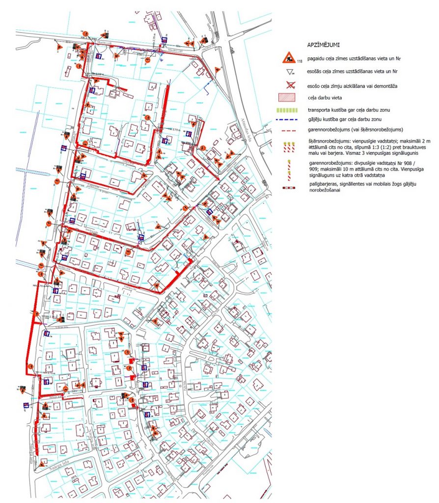 Pazemes komunikāciju izbūves darbu laikā ceļa darbu vietas ir ielu brauktuves un piegulošās teritorijas. Ielas sašaurinājuma vietās slēgta viena braukšanas josla, divvirzienu satiksme organizēta ar ceļa zīmēm pa vienu joslu (min platums – 2.75m). Darbus plānots veikt pa posmiem, atbilstoši nodrošinot ceļa aprīkojumu. Gājēju kustība tiks nodrošināta gar ceļa darbu vietu pa esošajām nomalēm.