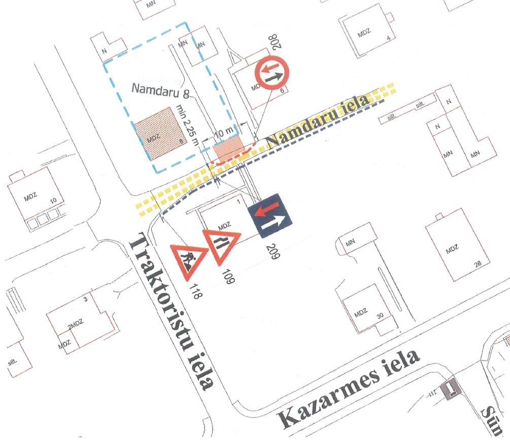 No 24. septembra līdz 24. oktobrim ierobežota satiksme Namdaru ielā, posmā no Namdaru ielas Nr. 2 ielas līdz Traktoristu ielai, būvdarbu laikā – kanalizācijas pievada izbūve, Jelgavā, ievērojot saskaņoto Satiksmes organizācijas shēmu.