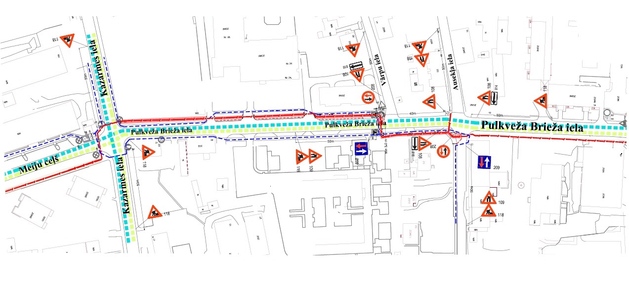 Pulkveža Brieža ielā ierobežota satiksme no Ausekļa ielas līdz Kazarmes ielai.