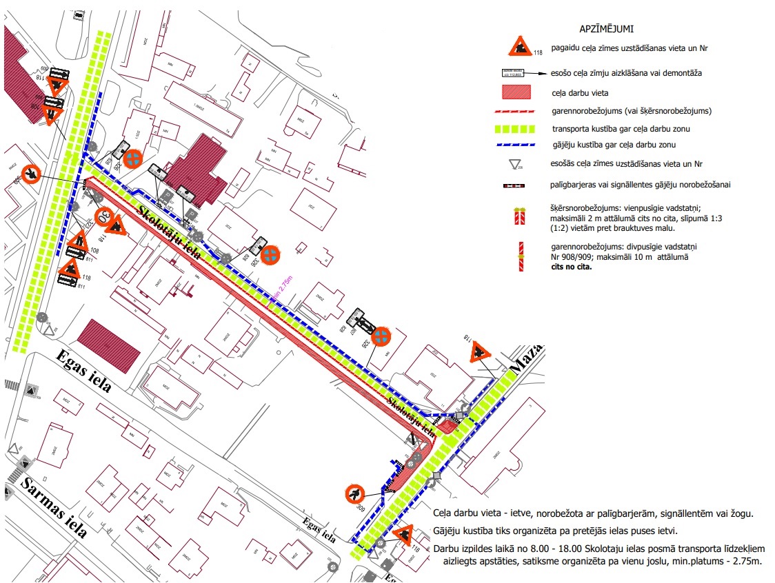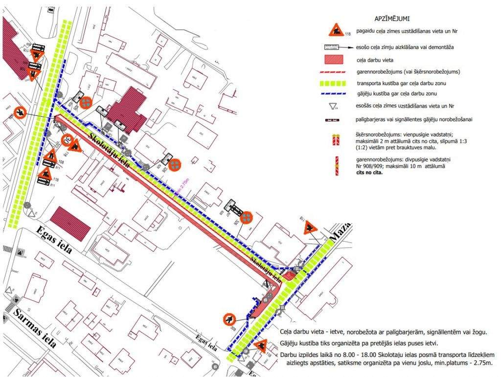 No 2. jūnija līdz 22. jūlijam ierobežota satiksme Skolotāju ielā, posmā no Dambja ielas līdz Mazajam ceļam, būvdarbu laikā – ietves seguma atjaunošanas darbi, ievērojot saskaņoto Satiksmes organizācijas shēmu.