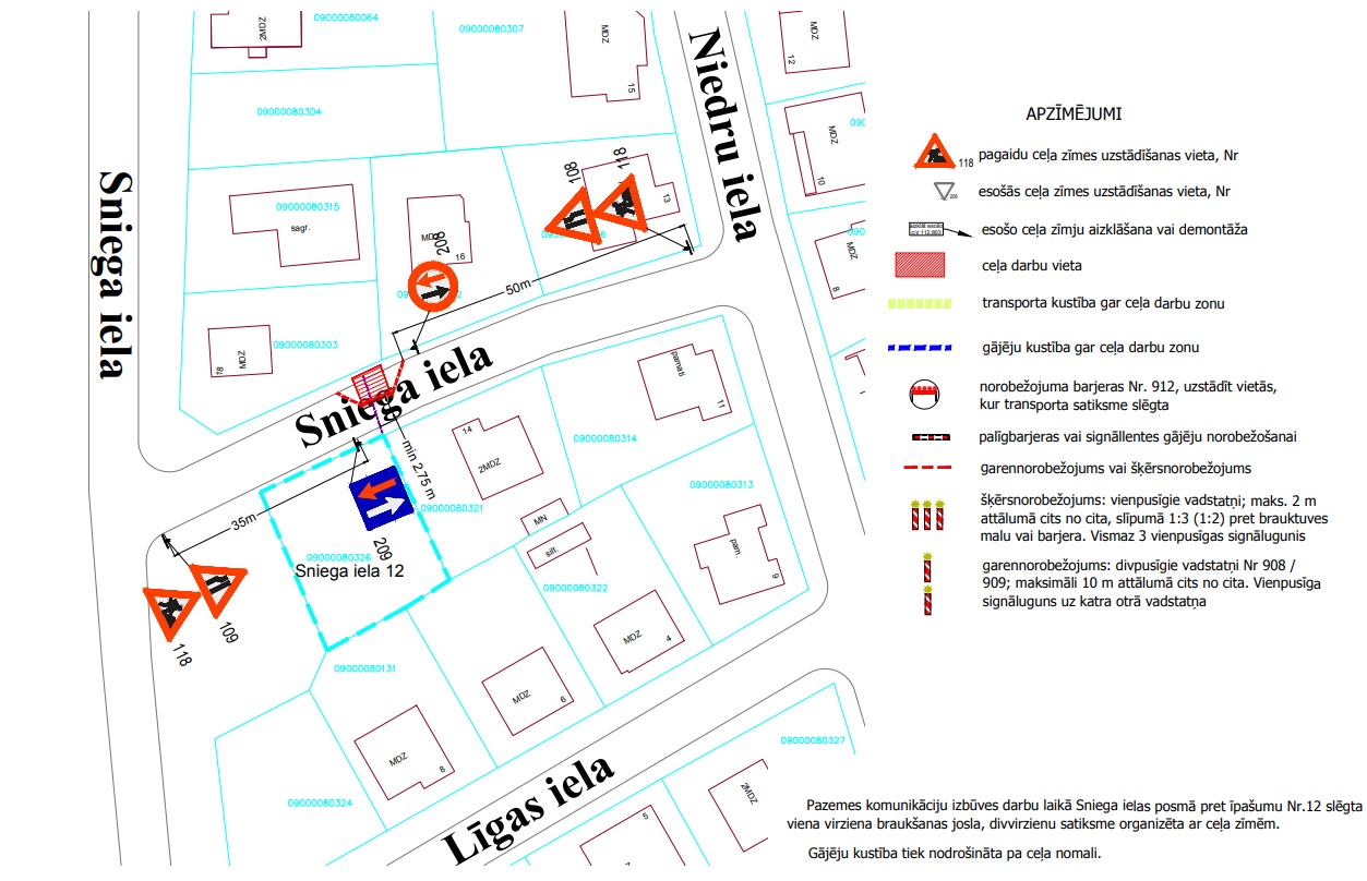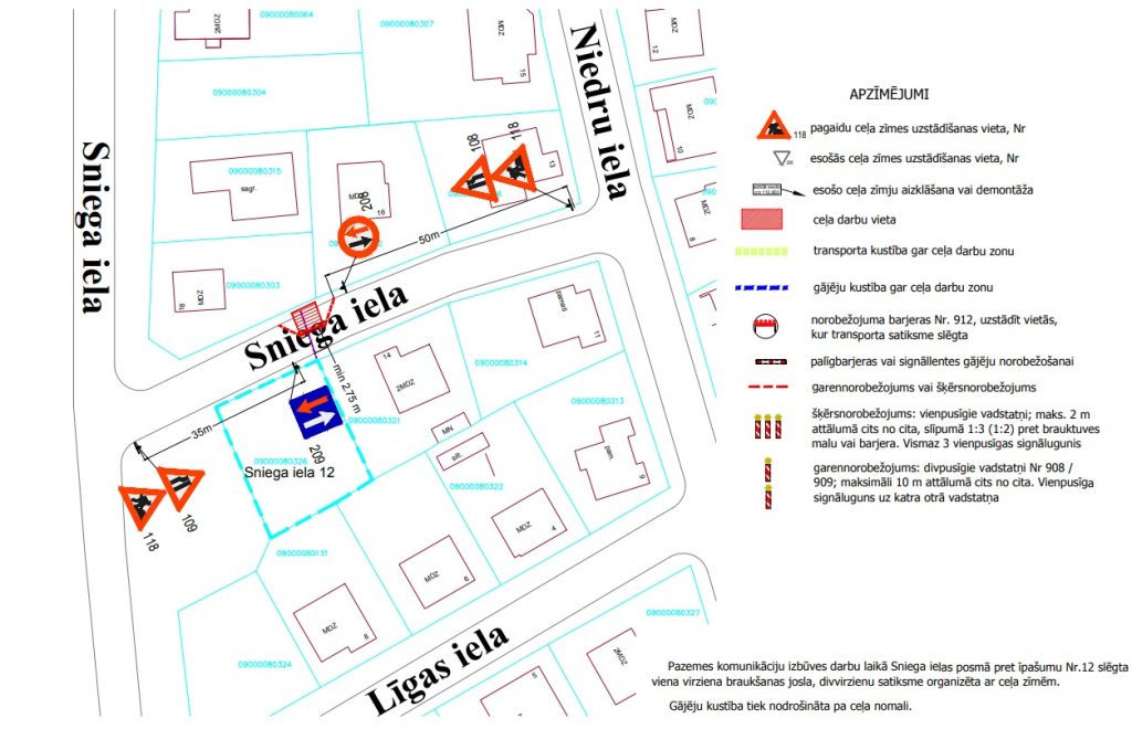 No 15. novembra līdz 26. novembrim ierobežota satiksme Sniega ielā, posmā no Niedru ielas līdz Sniega ielai Nr. 10, būvdarbu laikā – 0.4kV kabeļa guldīšana, ievērojot saskaņoto Satiksmes organizācijas shēmu.