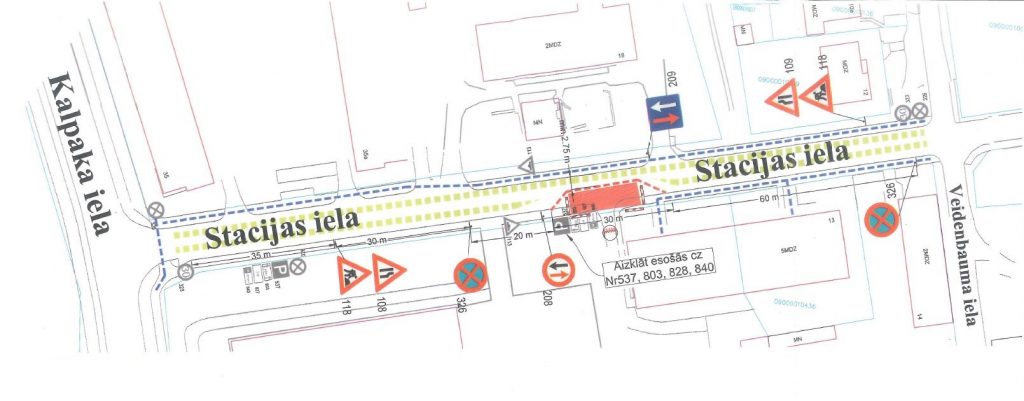 Līdz 15. maijam ierobežota satiksme Stacijas ielā, posmā no Eduarda Veidenbauma līdz Pulkveža Oskara Kalpaka ielai, būvdarbu laikā – kanalizācijas ārējo tīklu nomaiņa, ievērojot saskaņoto Satiksmes organizācijas shēmu.