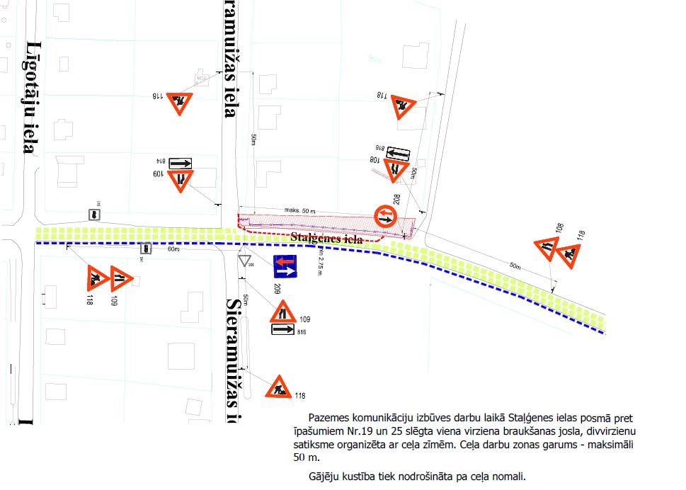 No 1. oktobra līdz 15. oktobrim ierobežota satiksme Staļģenes ielā, posmā no Līgotāju ielas līdz Nomales ielai, būvdarbu laikā – tranšejas rakšana, kabeļa guldīšana, ievērojot saskaņoto Satiksmes organizācijas shēmu.