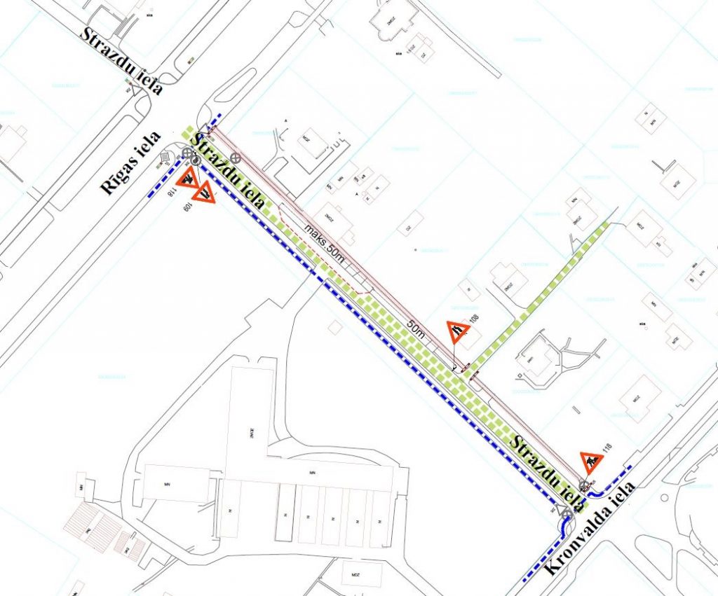 No 3. jūnija līdz 26. jūnijam ierobežota satiksme Strazdu ielā, posmā no Rīgas ielas līdz Kronvalda ielai, būvdarbu laikā – gājēju celiņa seguma atjaunošana, ievērojot saskaņoto Satiksmes organizācijas shēmu.