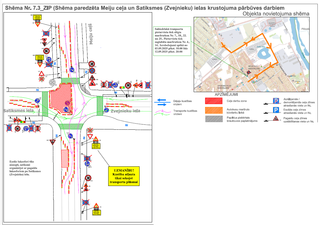 Izdots lēmums no 3.septembra (plkst. 09.00) līdz 12.septembrim ierobežot satiksmi un gājēju kustību Meiju ceļa, Satiksmes ielas un Zvejnieku ielas krustojumā. Darbu veikšanas laiks atkarīgs no tehnoloģiskā procesa.