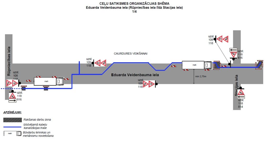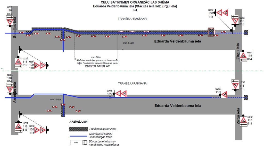 Ierobežot satiksmes un gājēju kustību, Jelgavā no 2026. gada 20. aprīļa plkst. 08:00 līdz 2026. gada 15. maijam plkst. 17:00 un Zirgu ielā krustojumā ar Eduarda Veidenbauma ielu, Jelgavā no 2026. gada 4. maija plkst. 08:00 līdz 2026. gada 4. maijam plkst. 17:00, būvdarbu laikā – optisko tīklu būvdarbi, ievērojot saskaņotās satiksmes organizācijas shēmas.