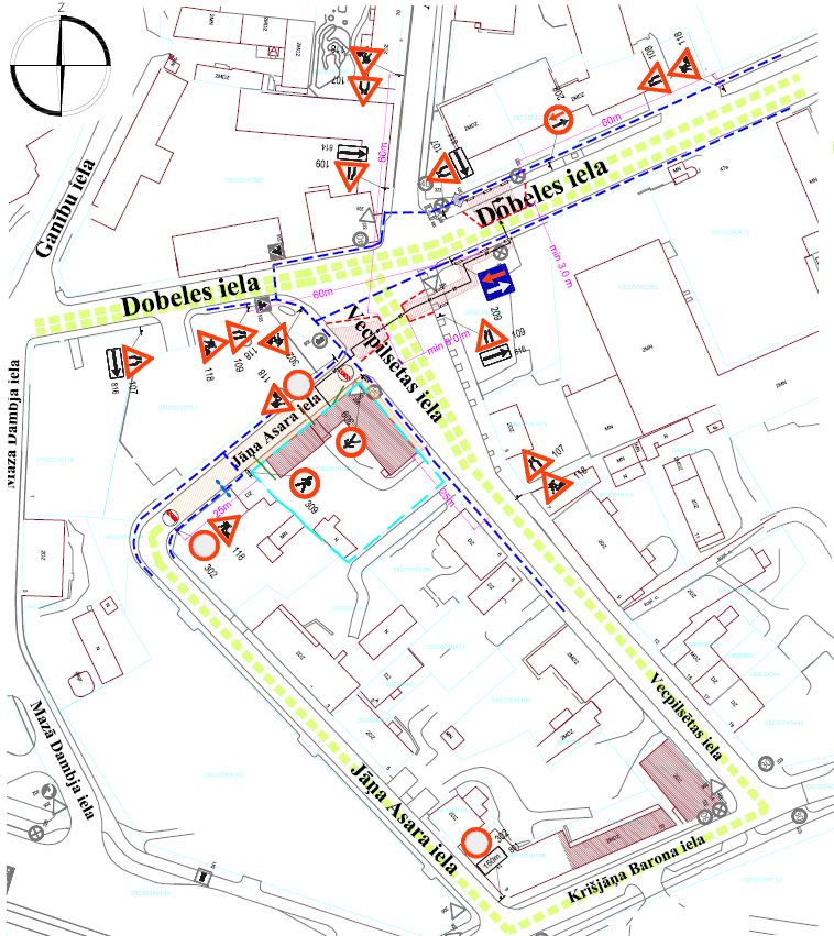 No 19. maija līdz 2. jūlijam ierobežota satiksme Vecpilsētas ielā, posmā no Dobeles ielas līdz Krišjāņa Barona ielai, un Dobeles ielā, posmā no Pulkveža Brieža ielas līdz Vecpilsētas ielai, – siltumtrases, ūdensvada, saimnieciskās un lietus kanalizācijas izbūve, ievērojot saskaņoto Satiksmes organizācijas shēmu.