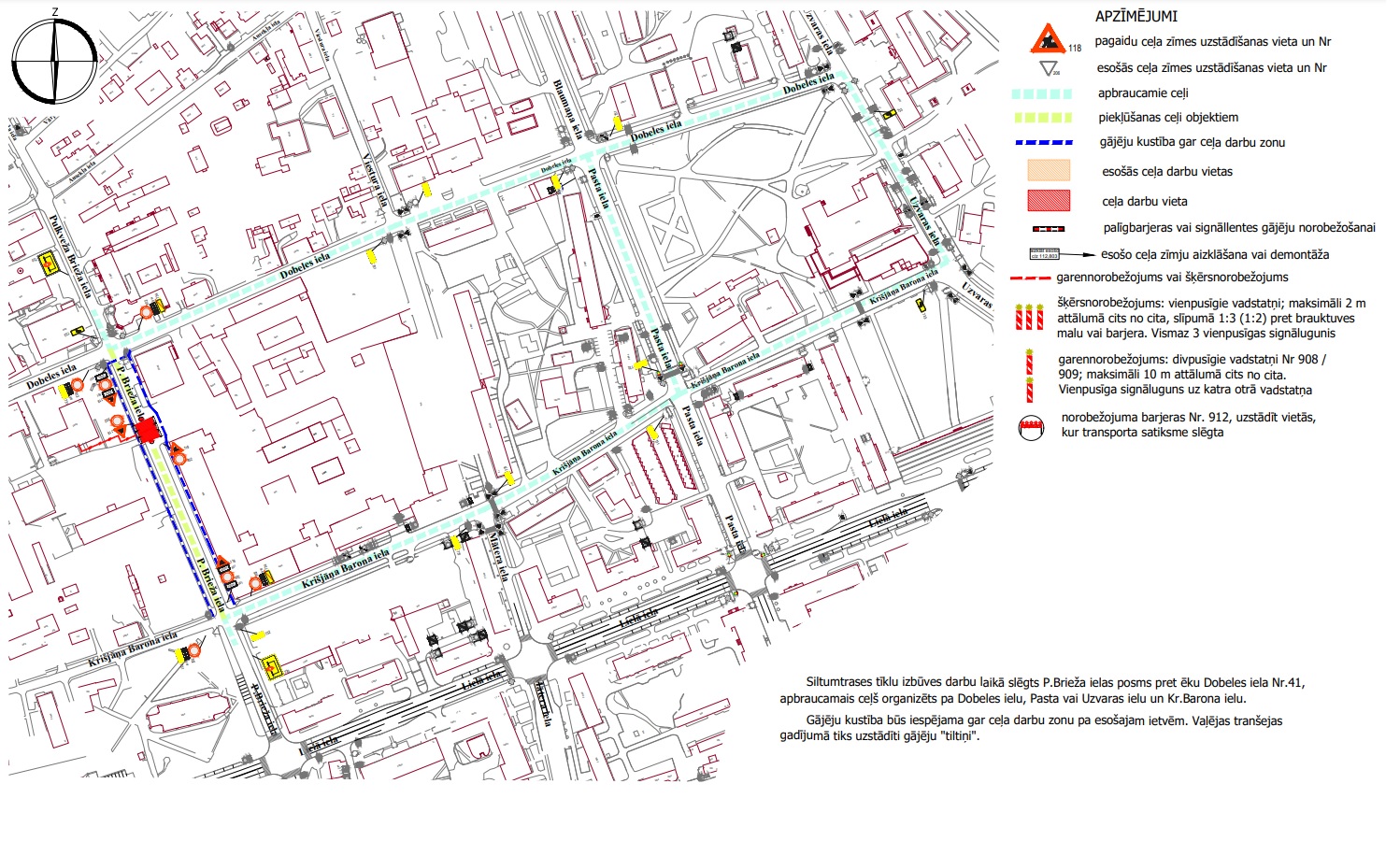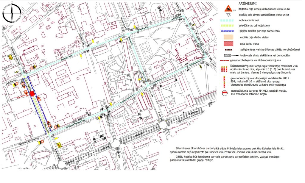No 15.jūnija plkst. 08.00 līdz 16.jūnija plkst. 20.00 slēgta satiksme Pulkveža Brieža ielā, posmā no Krišjāņa Barona ielas līdz Dobeles ielai, būvdarbu laikā – siltumtrases izbūve, ievērojot saskaņoto Satiksmes organizācijas shēmu. Apbraucamais ceļš organizēts pa Dobeles ielu, Pasta ielu vai Uzvaras ielu un Krišjāņa Barona ielu. Gājēju kustība būs iespējama gar ceļa darbu zonu pa esošajam ietvēm.