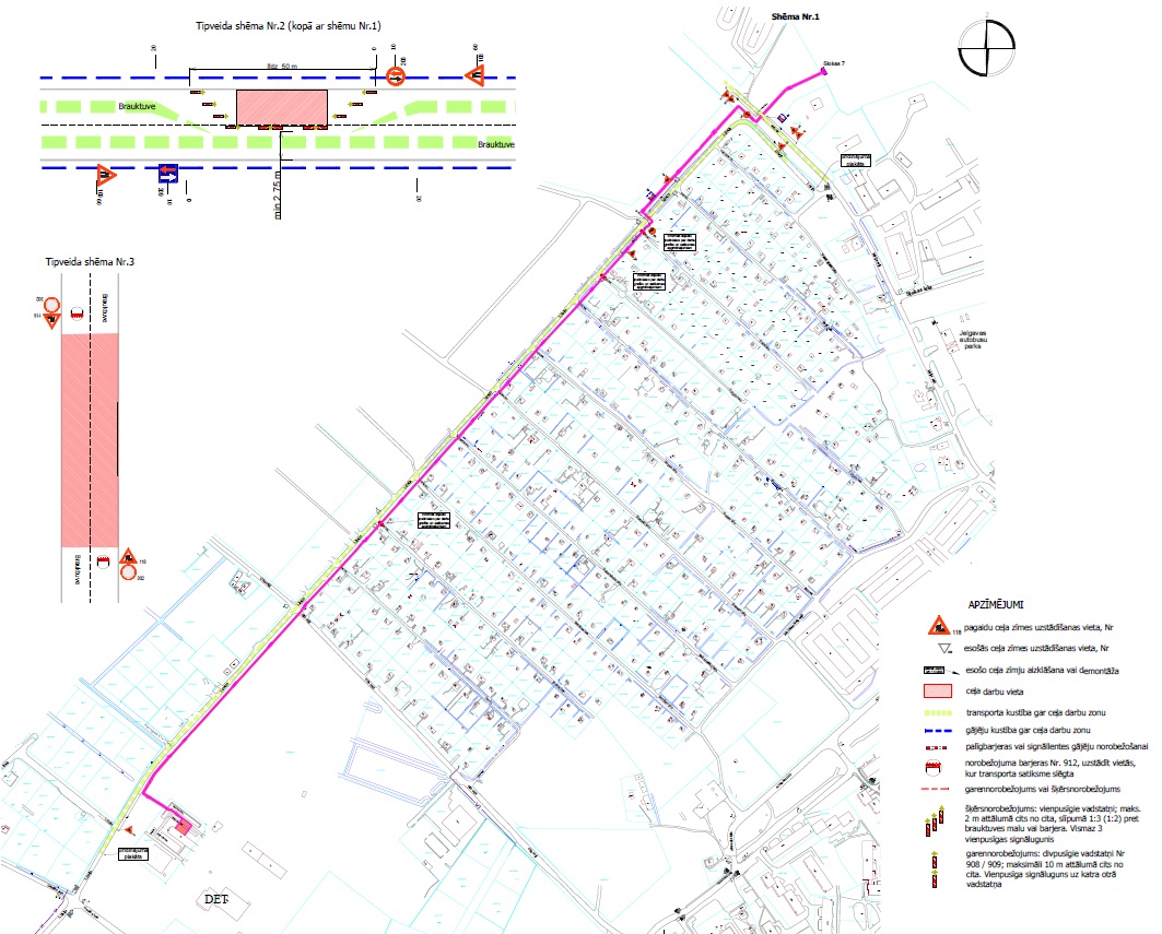 Ja nebūs iespējams nodrošināt minimālu joslas platumu – 2.75m, paredzēts slēgt brauktuvi visā platumā (tipveida shēma Nr.3).