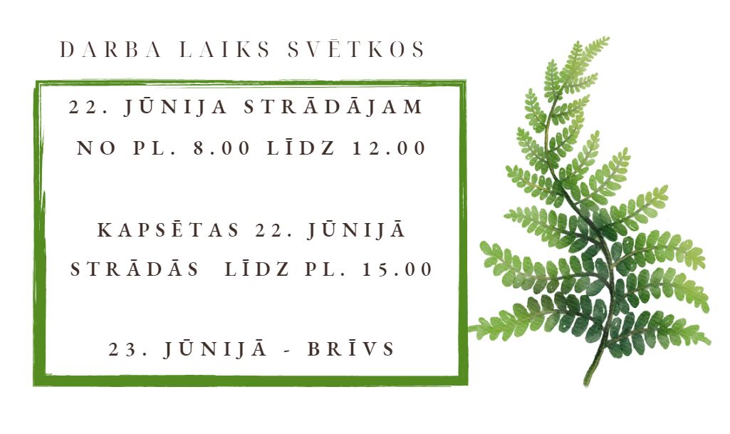 Iestādes darba laiks Līgo svētkos Darba laiks svētkos Pašvaldības iestādes “Pilsētsaimniecība” darba laiks svētkos. KapsētasPilsētsaimniecībaDalītiesFacebookTwitterGoogle+PinterestLinkedIn Līdzīgi rakstiInformācija par JVPI “Pilsētsaimniecība” cenu aptaujām publicēta iestādes tīmekļvietnē10.12.2025Apsveikums Latvijas Republikas Proklamēšanas dienā14.11.2025Kapsētās aicina lapas vākt maisos un novietot speciāli tām paredzētās vietās05.11.2025