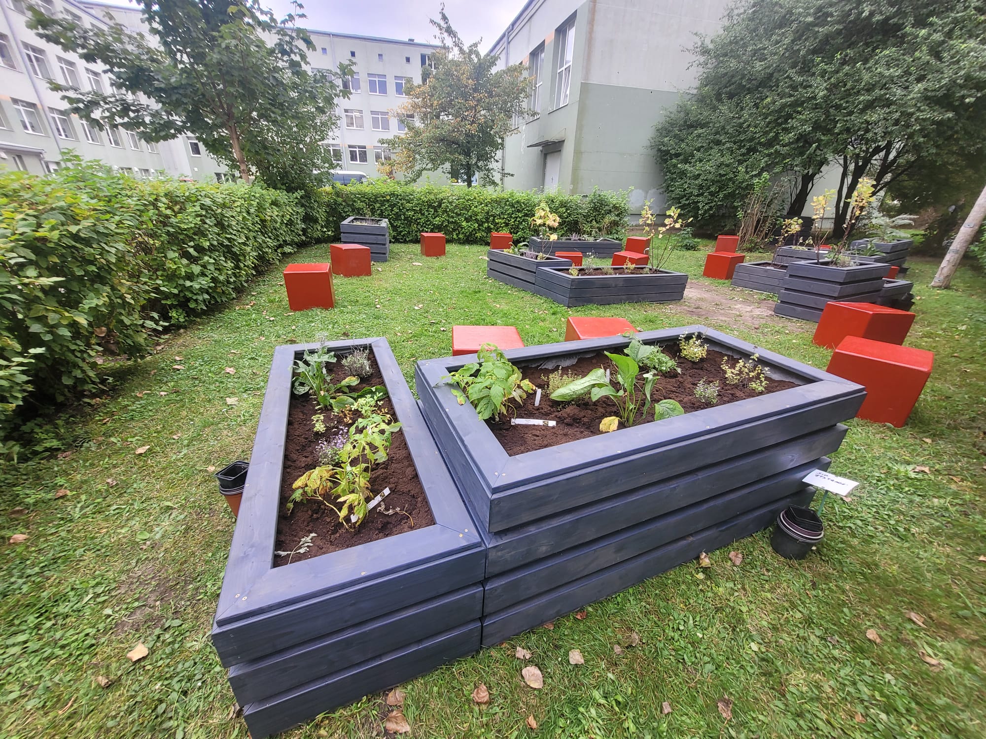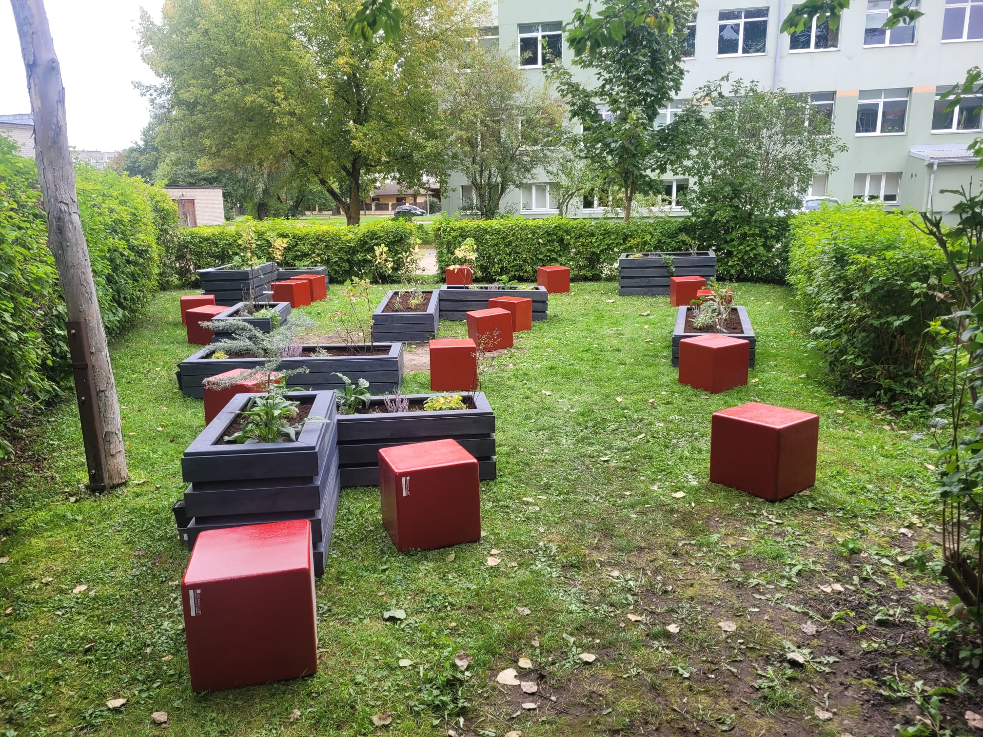 Projektā skolas teritorijā Sarmas ielā 2 ir uzstādītas desmit atšķirīga augstuma dārza kastes ar dažādiem augiem, komposta kaste un 16 stiklšķiedras kubi sēdēšanai, radot pievilcīgu un funkcionālu zonu skolēnu atpūtai un mācībām. Stiklšķiedras sēdekļi atbilst skolas simbolikai un ir sarkanā krāsā, četru dažādu izmēru dārza kastes ir tumši pelēkas, un viena no tām paredzēta komposta veidošanai. Augu sortimentā ietilpst garšaugi un ārstniecības augi, bet pavasarī zona tiks papildināta ar viengadīgajiem augiem. Savukārt komposta kaste veicina zaļā dzīvesveida paradumus un nodrošina iespēju praktiskām mācībām.
