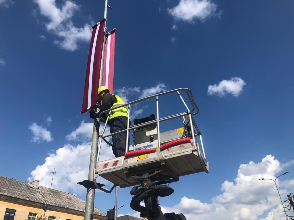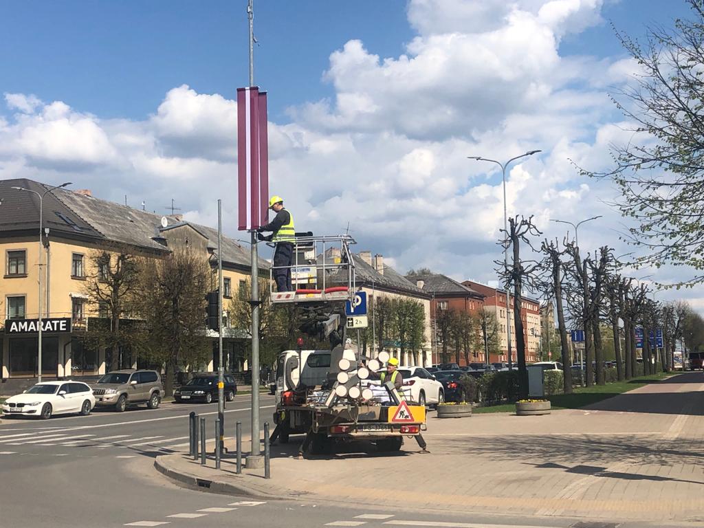 Savukārt Lielās ielas apgaismes balstus rotās sarkanbaltsarkani karogi. Tos šonedēļ sāks uzstādīt visā Lielās ielas posmā.