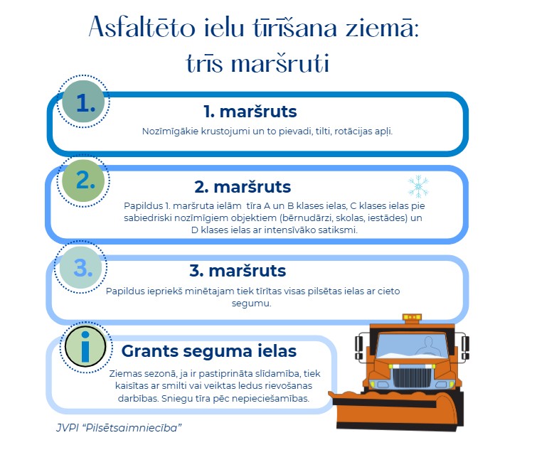 1. maršrutā tīra nozīmīgākos satiksmes mezglus, krustojumus un to pievadus, tiltus un rotācijas apļus. 2.maršrutā A un B klases ielas, sabiedriskā transporta maršrutus, tranzītielas, tiltus un pārvadus, kā arī ielas pie sabiedriski nozīmīgiem objektiem – skolām, iestādēm. 3. maršrutā tīra visas pilsētas ielas ar cieto segumu. Grants seguma ielas ziemas sezonā tiek tīrītas pēc nepieciešamības, un pastiprinātas slīdamības gadījumā tiek kaisītas ar smilti vai tiek veikta ledus rievošana ar greideri.
