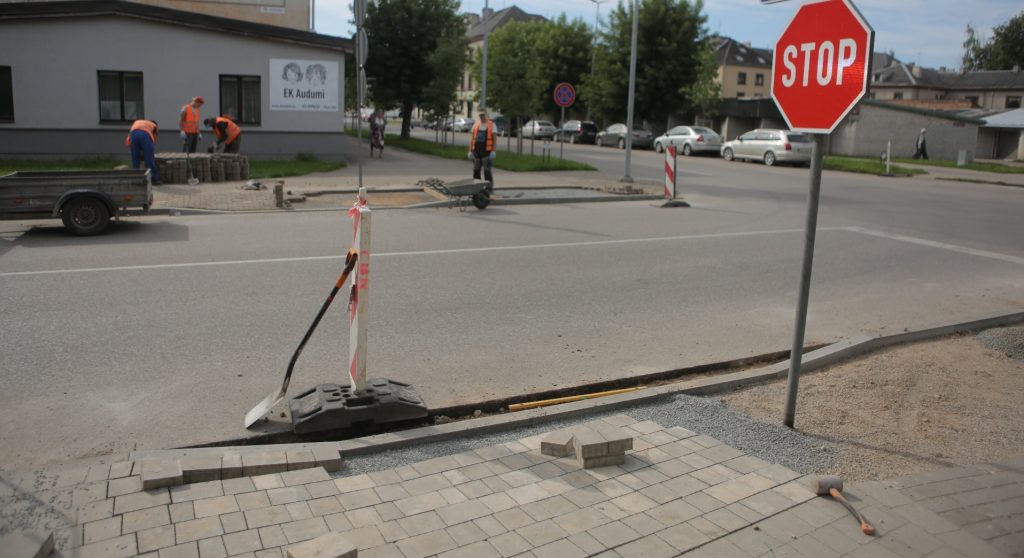 Gājēju pāreju ierikošanai nepieciešams pārbūvēt ielu apmales un ietvju bruģa segumu. Darbus veic SIA “KULK” un tos plānots pabeigt septembra sākumā.