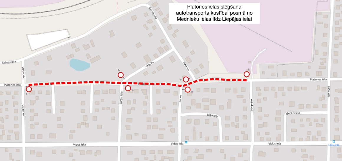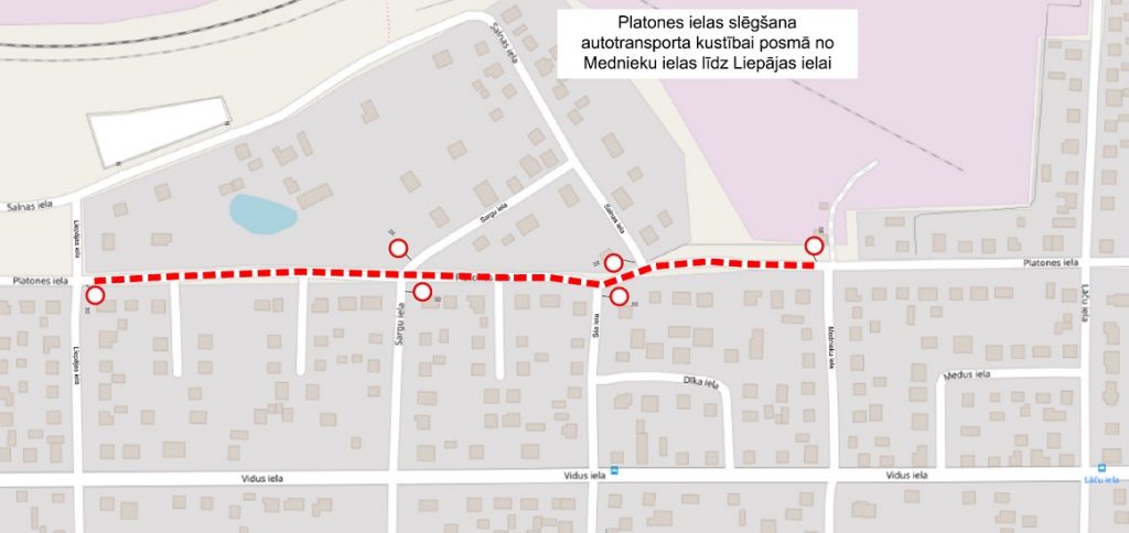 No 24. februāra vakara autotransporta kustībai slēgts Platones ielas posms no Liepājas ielas līdz Mednieku ielai. Ielā uzstādītas ceļa zīmes Nr. 302 “Braukt aizliegts”.