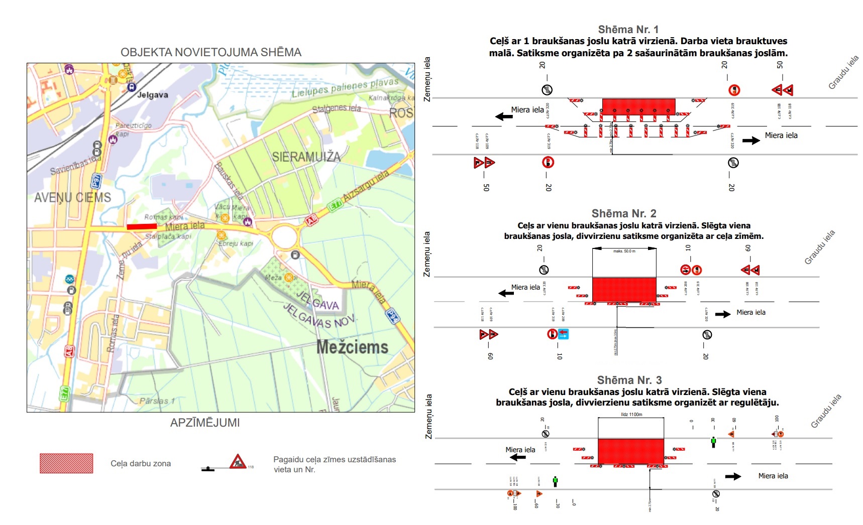 No 21.augusta līdz 31.oktobrim ierobežota satiksme Miera ielā, posmā no Zemeņu ielas līdz Graudu ielai, būvdarbu laikā – teritorijas (Miera iela 3A, Jelgava) labiekārtošana, ievērojot saskaņoto satiksmes organizācijas shēmu.