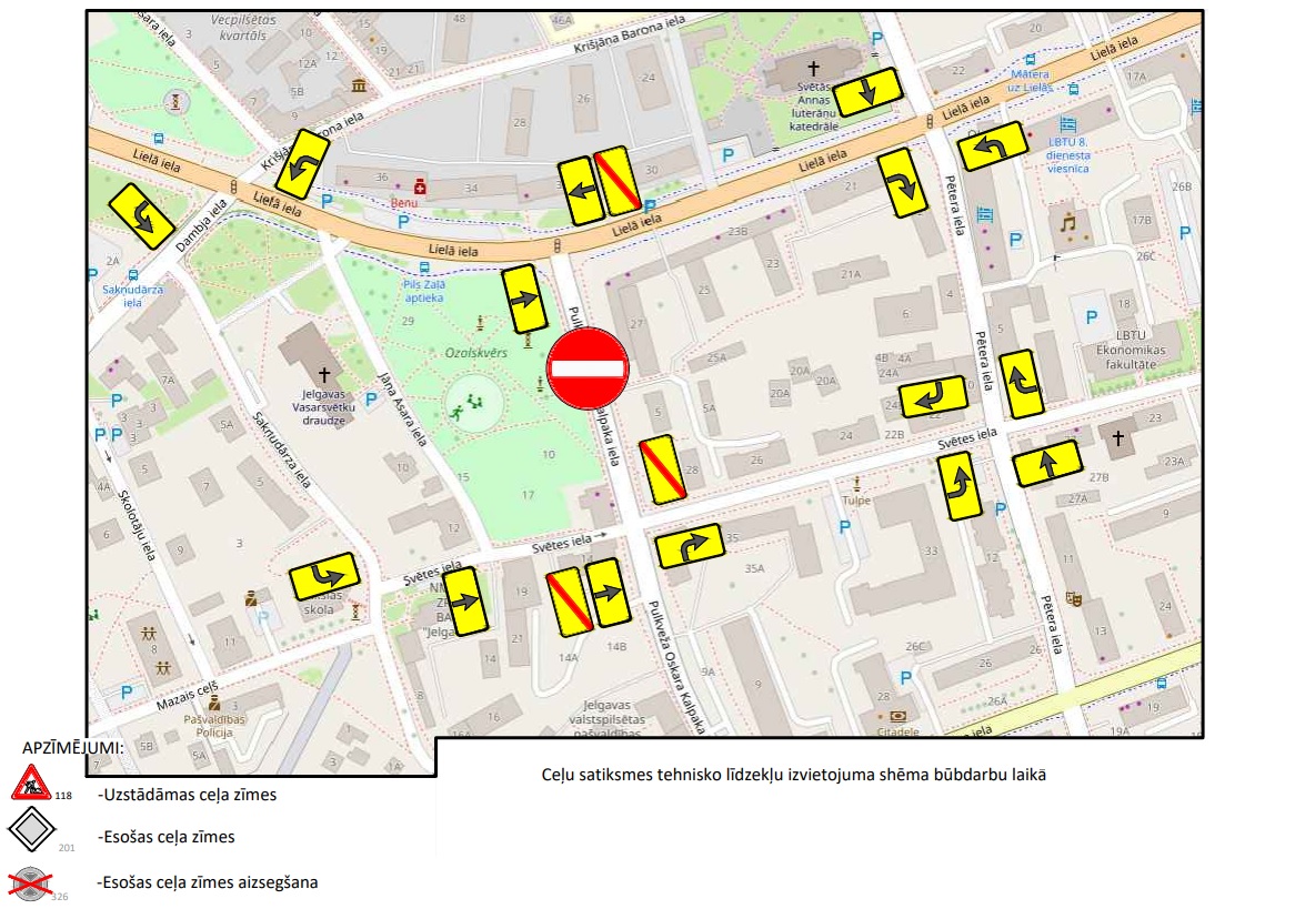 Naktī uz trešdienu tiks izvietotas ceļa zīmes, ka ielas posms ir slēgts. Transportlīdzekļu vadītāji slēgto ielas posmu aicināti apbraukt pa Svētes ielu, Pētera ielu, Dambja ielu un Sakņudārza ielu. Jāpiebilst, ka piekļuve daudzdzīvokļu mājām (Lielajā ielā 27, 25, Pulkveža Oskara Kalpaka ielā 5) tiks nodrošināta pa iebrauktuvi no slēgtā ielas posma.