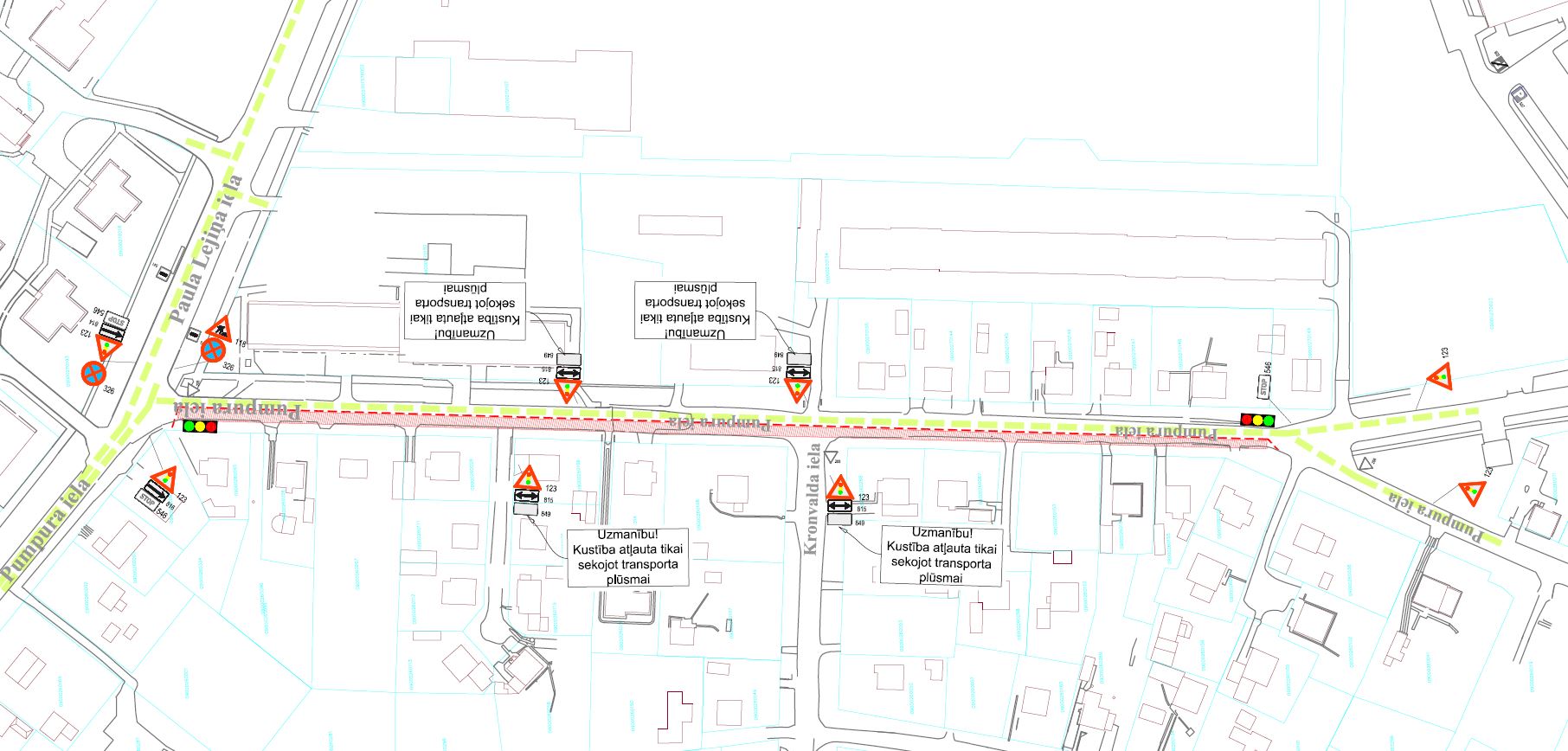 No 12. jūnija Pumpura ielas posmā no Paula Lejiņa ielas līdz Helmaņa ielai ir slēgta viena virziena braukšanas josla, divvirzienu satiksme organizēta ar pagaidu luksoforu.