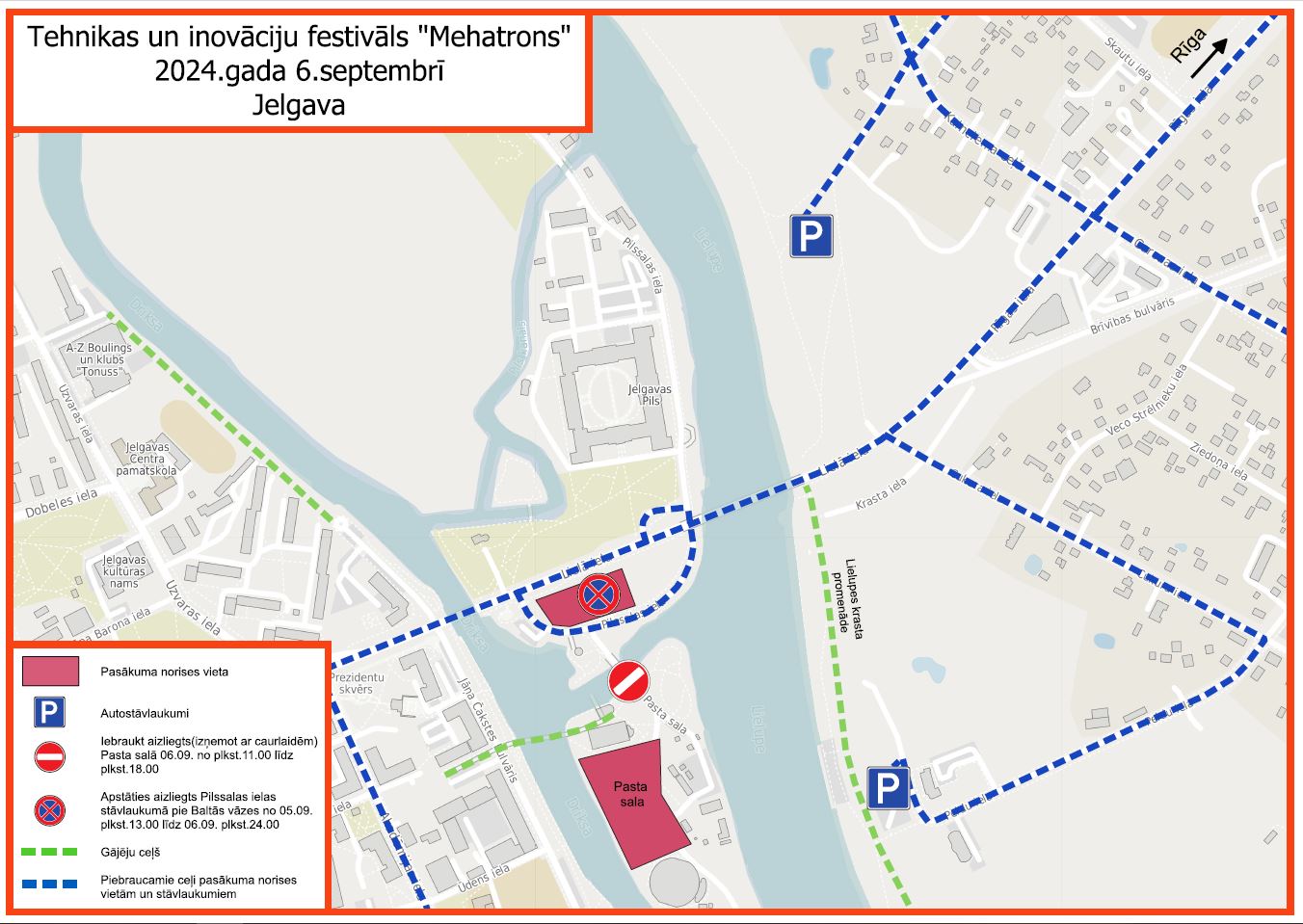 Piektdien, 6. septembrī, Pasta salā notiks tehnikas un inovāciju festivāls “Mehatrons”, un piektdienas vakarā autostāvvietā Pilssalas ielā 1 (pie baltās vāzes) būs skaņas izaicinājuma turnīrs. Tādēļ jau no ceturtdienas, 5. septembra, pulksten 13 stāvlaukumā aizliegts novietot transportlīdzekļus. Autovadītāji aicināti izmantot stāvvietu pļavā pretī Jelgavas pilij vai auto novietot citviet pilsētā.