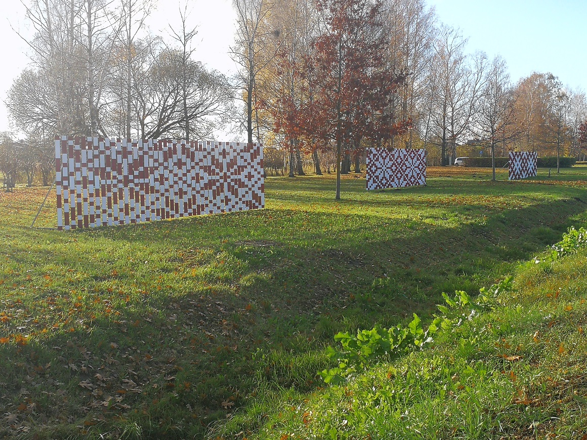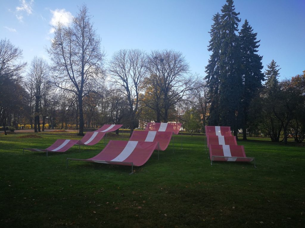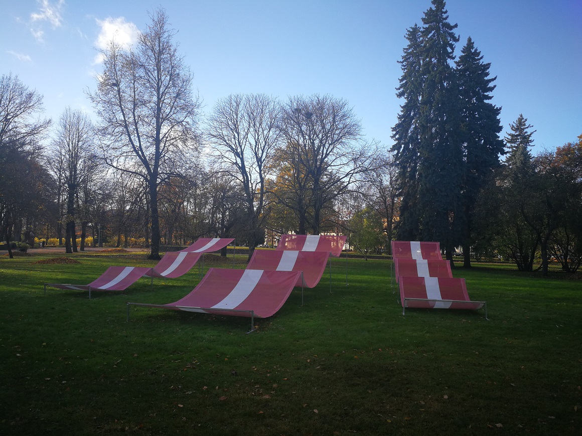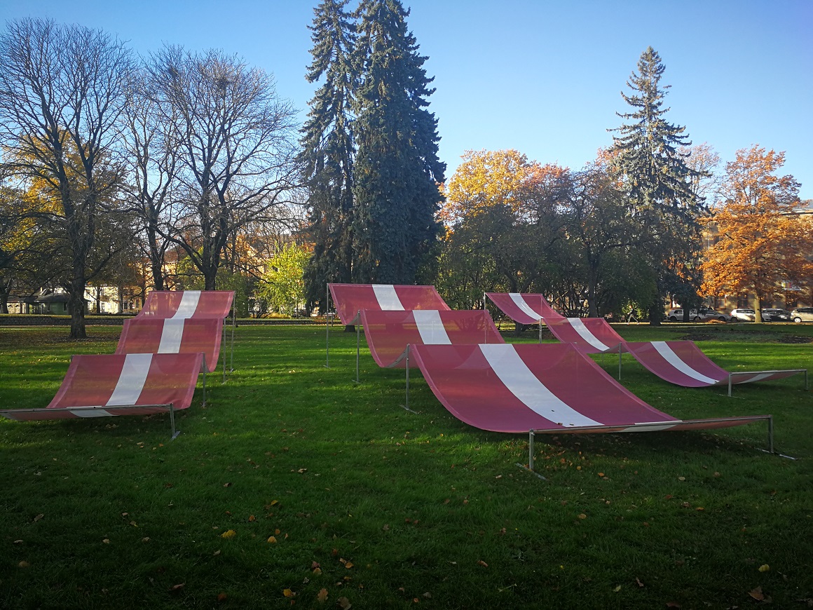 - metāla karkasi ar lielformāta karoga baneriem Raiņa parkā;