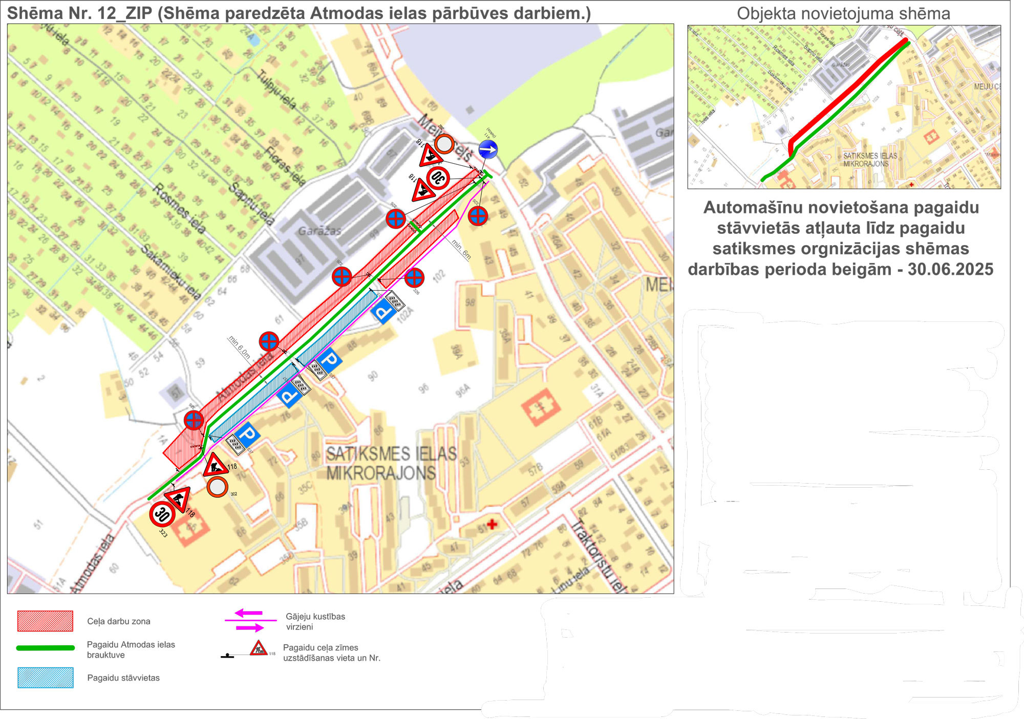 Būvdarbu zonā, kas norādīta shēmā, transportlīdzekļiem apstāties ir aizliegts. Uz izveidotās pagaidu brauktuves visā tās garumā jāievēro maksimālais braukšanas ātrums – 30 km/h.