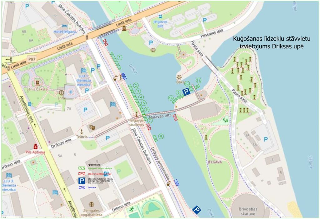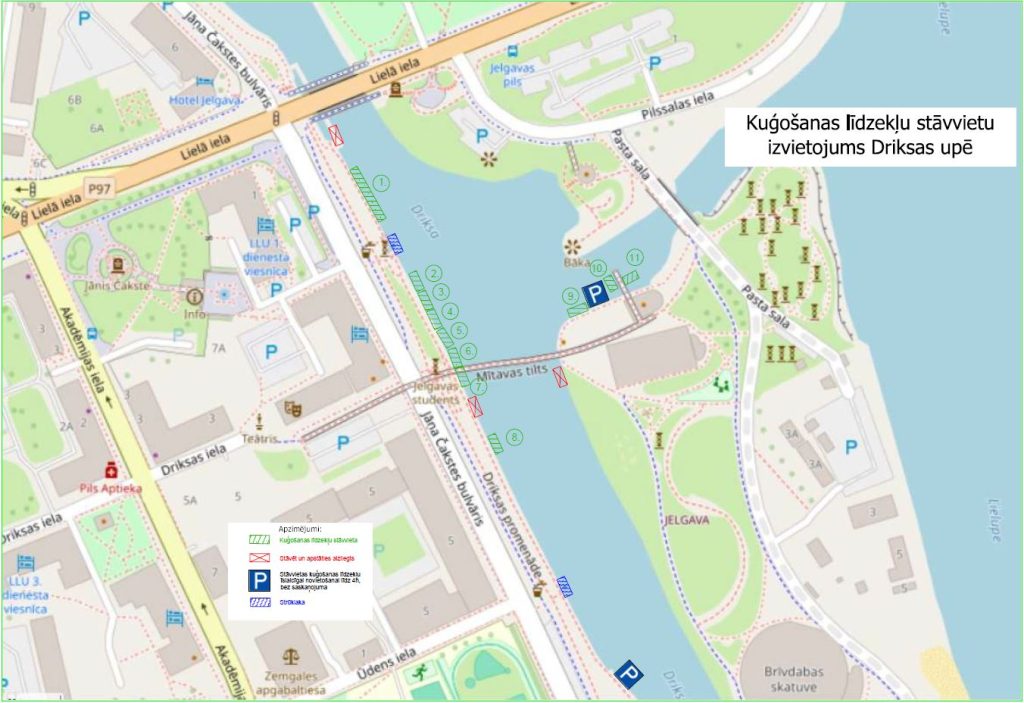 Kuģošanas līdzekļu stāvvietas Driksas upes krastā paredzētas kuģošanas līdzekļiem, kurus lieto komercdarbības veikšanai Jelgavas valstspilsētas administratīvajā teritorijā ietilpstošajā Lielupes upes daļā un Driksas upē.