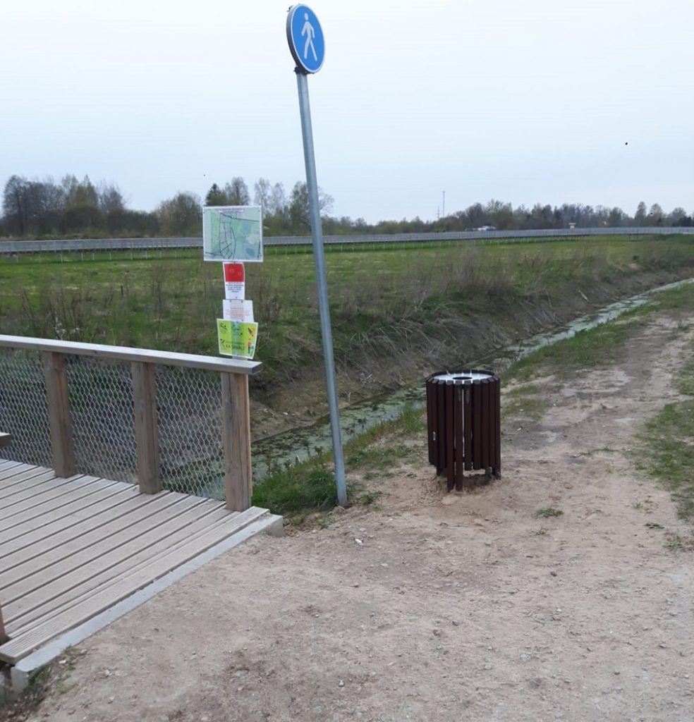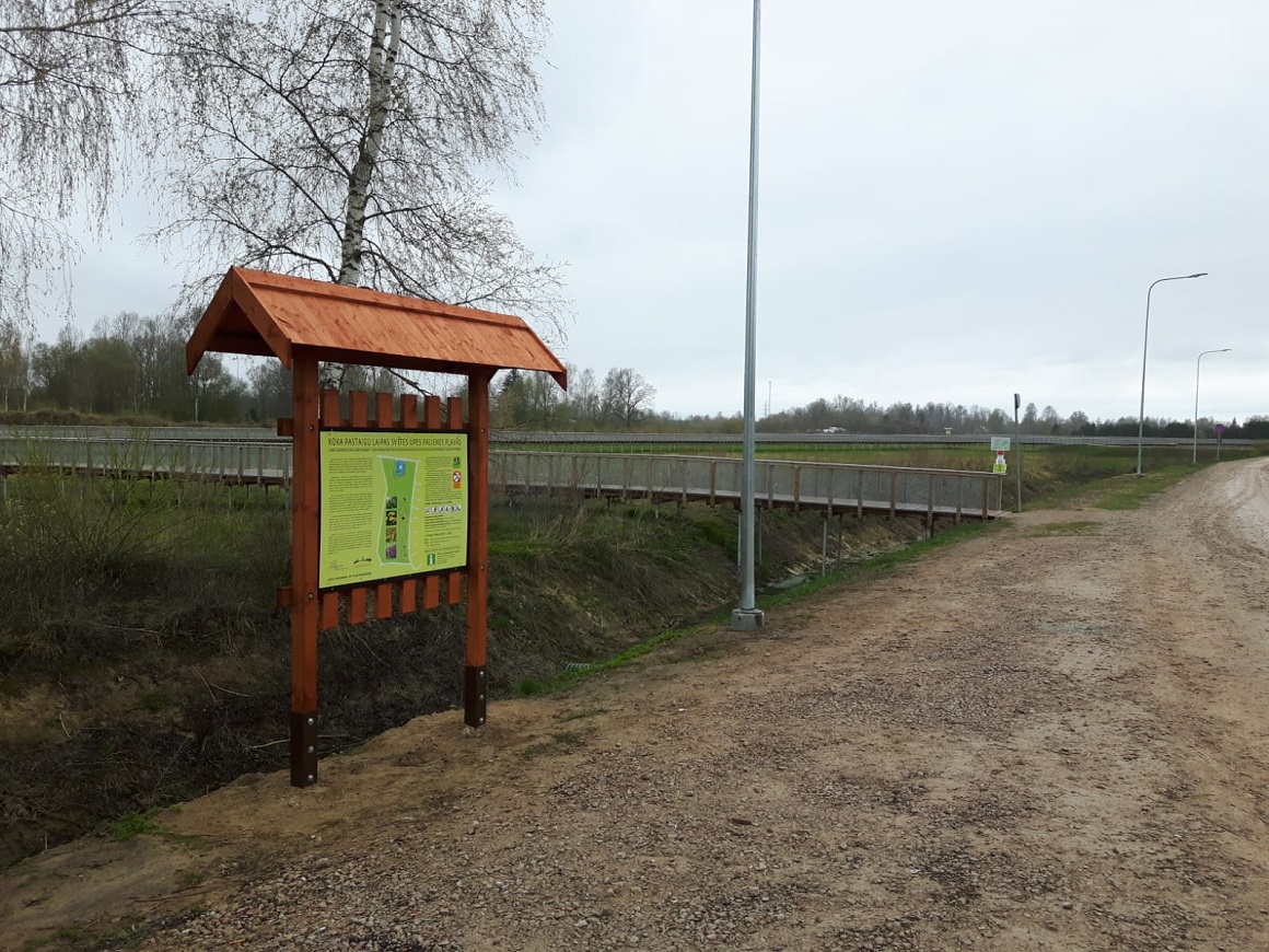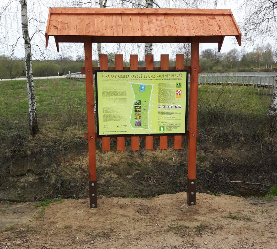 Pie koka pastaigu laipām Svētes palienes pļavās uzstādīts trešais informatīvais stends un atkritumu urnas