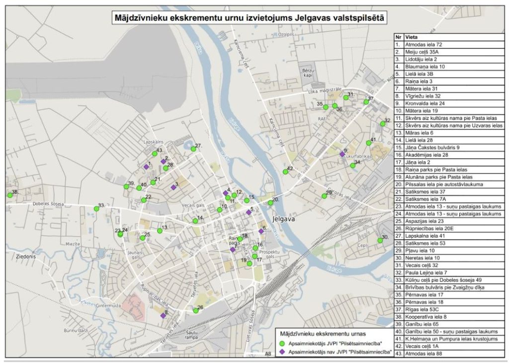 Pie uzejām uz laipām ir uzstādītas atkritumu urnas, kurās var izmest suņu ekskrementus. Atgādinām, ka vietās, kur speciālās urnas nav pieejamas, ekskrementus var mest arī nešķiroto sadzīves atkritumu konteinerā. Jelgavā šobrīd ir pilsētā uzstādītas 43 dzīvnieku ekskrementu urnas, kuras apsaimnieko gan “Pilsētsaimniecība”, gan SIA “Jelgavas nekustamā īpašuma pārvalde”. Šīs urnas tiek iztukšotas katru dienu, nepieciešamības gadījumā arī izmazgātas.