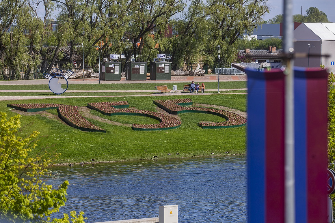 Jelgavas pilsētas svētku nedēļai sākoties, Pasta salā Driksas upes krasta nogāzē izveidotajā puķu dobē par godu pilsētas 755. jubilejai iestādītas ap 3500 rozā leduspuķes.
