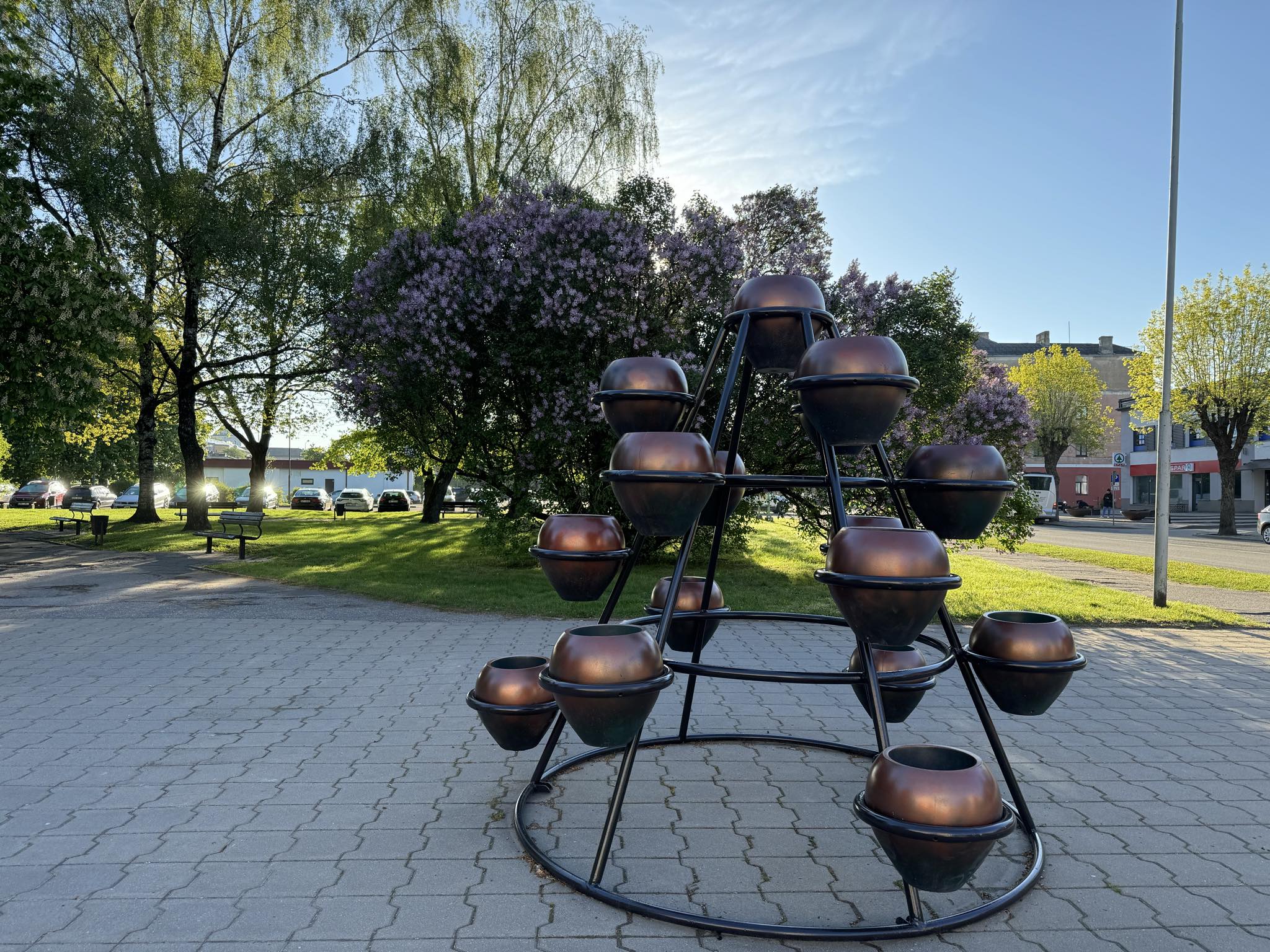 Metāla statīvos izvietoti jauni puķu podi – bumbiera formā. Tie izgatavoti no betona un nokrāsoti ar divu veidu krāsām, iegūstot bronzas toni. Kopumā nomainīti 36 podi. Iestājoties siltākam laikam, tajos tiks iestādītas vasaras puķes.